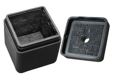 This silicone rubber mold will allow hungry Star Trek fans to cast up gelatin and chocolate in the shape of a 1.5″ Borg cube, thereby turning one of the Federation’s greatest threats into a bite-size morsel of deliciousness. Or make a Borg ice cube, and keep your beverage of choice as cold as the depths of space! Refreshment is futile! Comes packaged in a full-color window box.