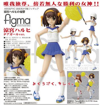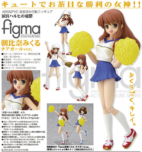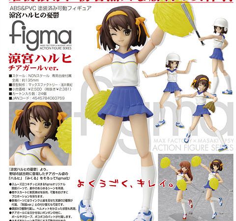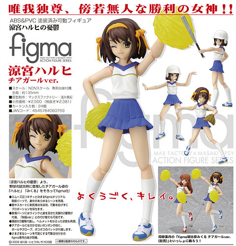 New Figma figures due in march by Max Factory are the cheerleader versions of Suzumiya Haruhi & Asahina Mikuru from The Melancholy of Haruhi Suzumiya. Complete with helmets, pom poms, baseball bats & a display stand, these figures are able to recreate iconic poses from the hit anime series. Each figure will retail for 2,500 yen.