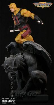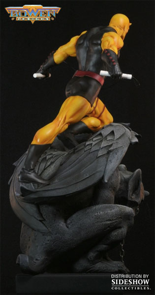 The Daredevil Yellow Statue stands over 15 inches high and includes poseable wire and a 3-inch booster base, extending the statue to a stately 18 inches. This intricately sculpted statue is cast in high-quality polystone, a great addition to any Marvel collection!