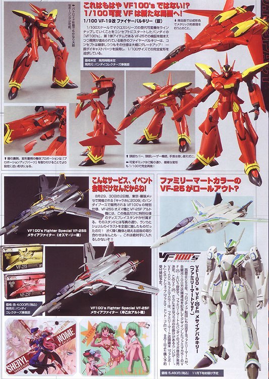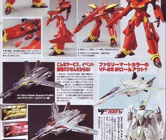 The VF-19 will feature significantly less parts swapping compared to the previous VF-25 releases. It will also make for a more durable substitute to the vintage 1/100 model kit. Diecast metal will also be utilized in this figure. Also shown is the Family Mart exclusive VF-25F, and limited, fixed fighter mode, metallic VF-25F and VF-25S! Click on the thumbnail to the left to take a closer look!