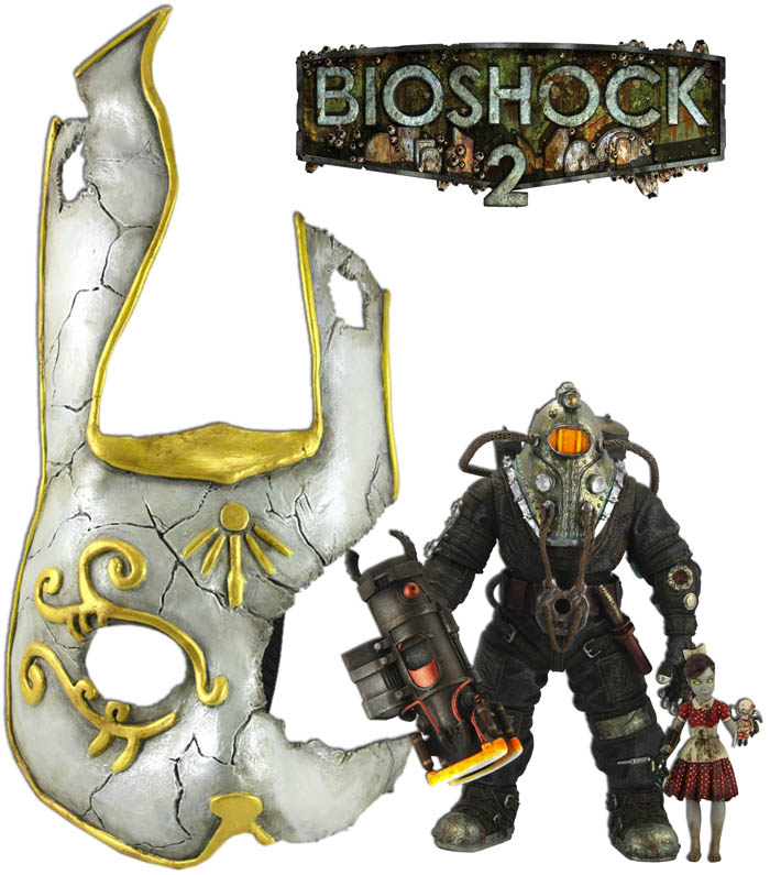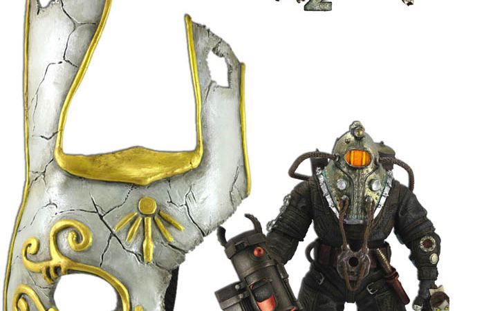 NECA’s Twitter Page has updated with a couple new photos showing an upcoming Bioshock 2 gift pack. The gift pack will include a Big Daddy Delta, a Little Sister and a life-sized Splicer Mask. Teh set will be exclusive to Toys “R” Us stores.