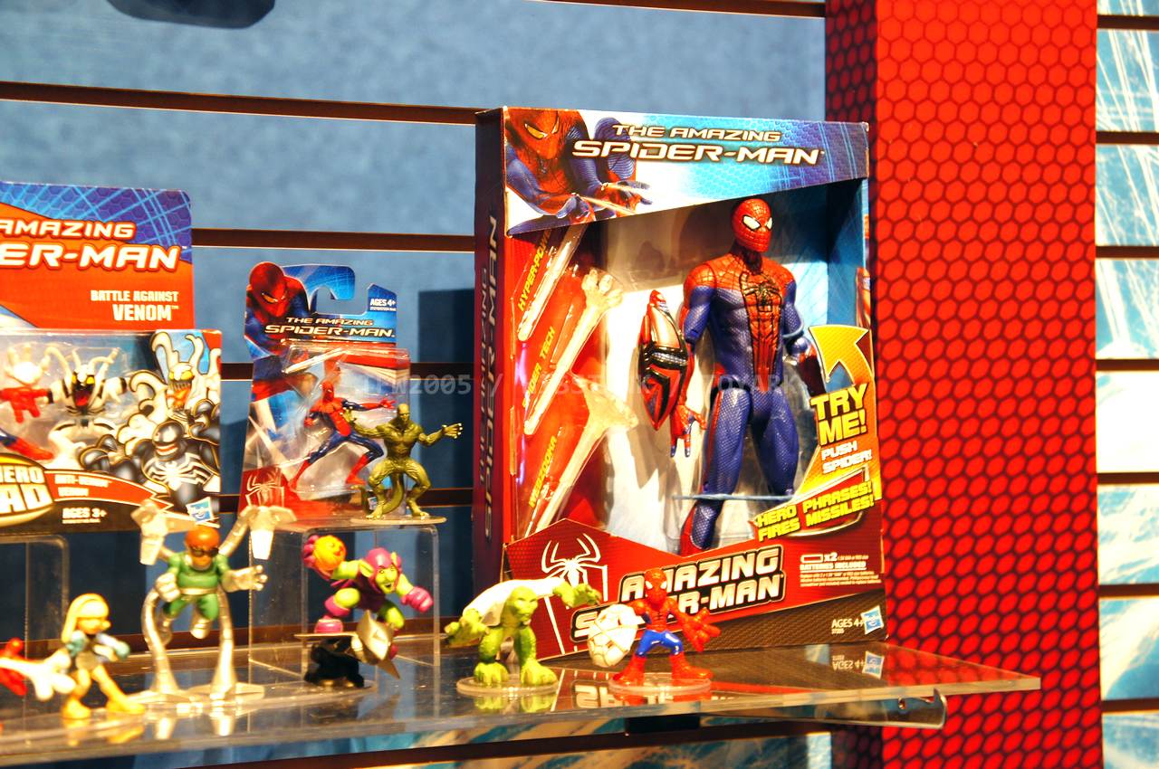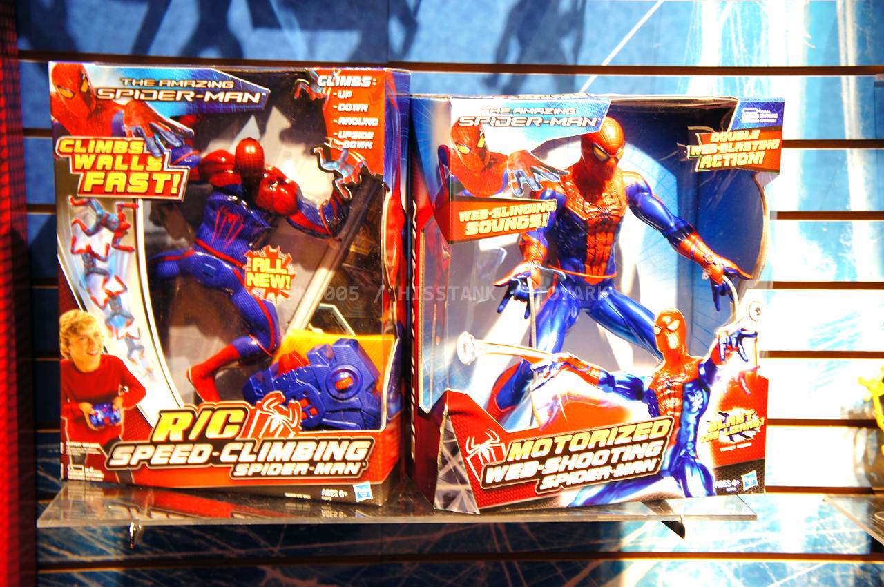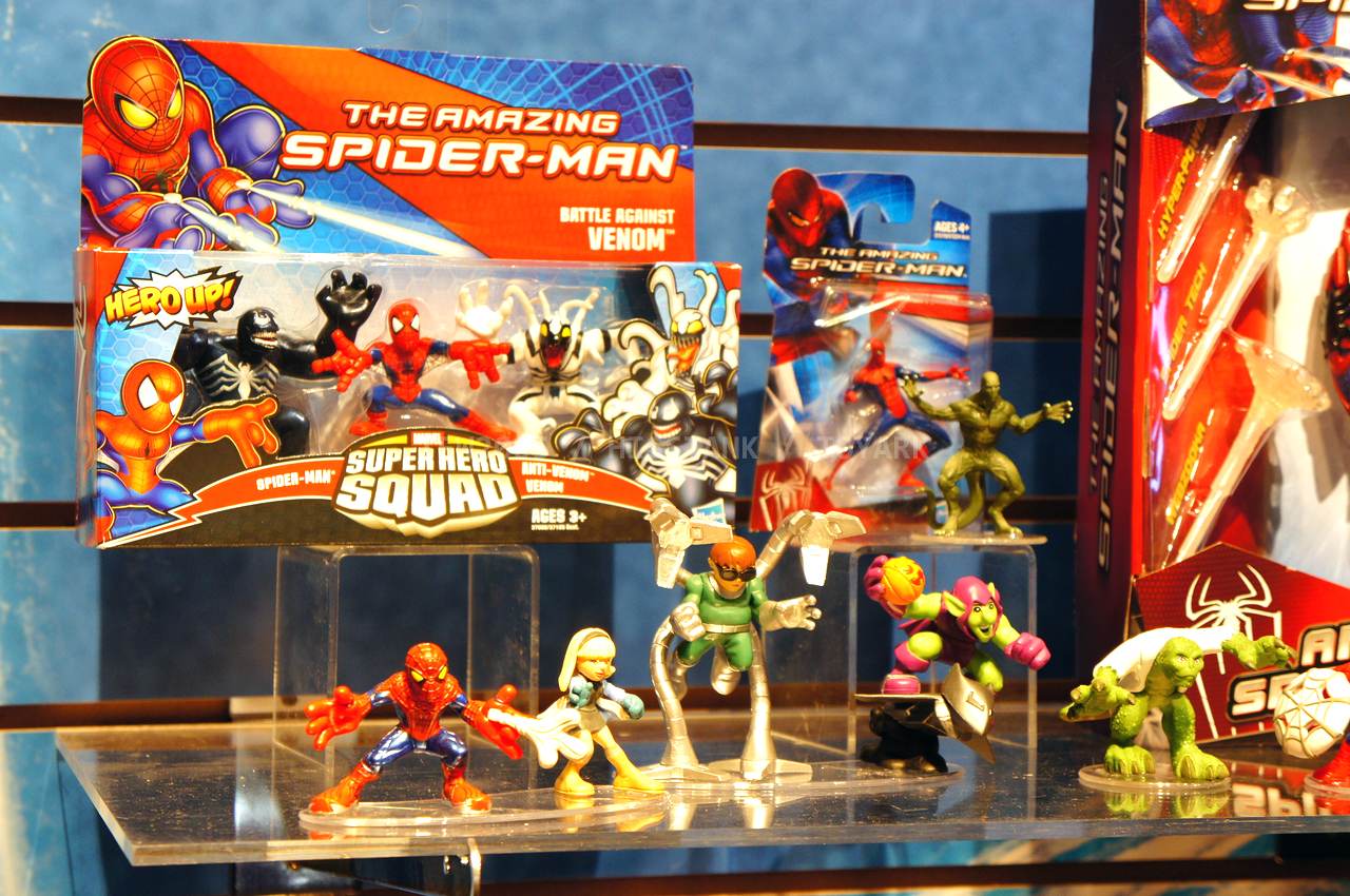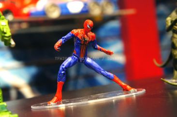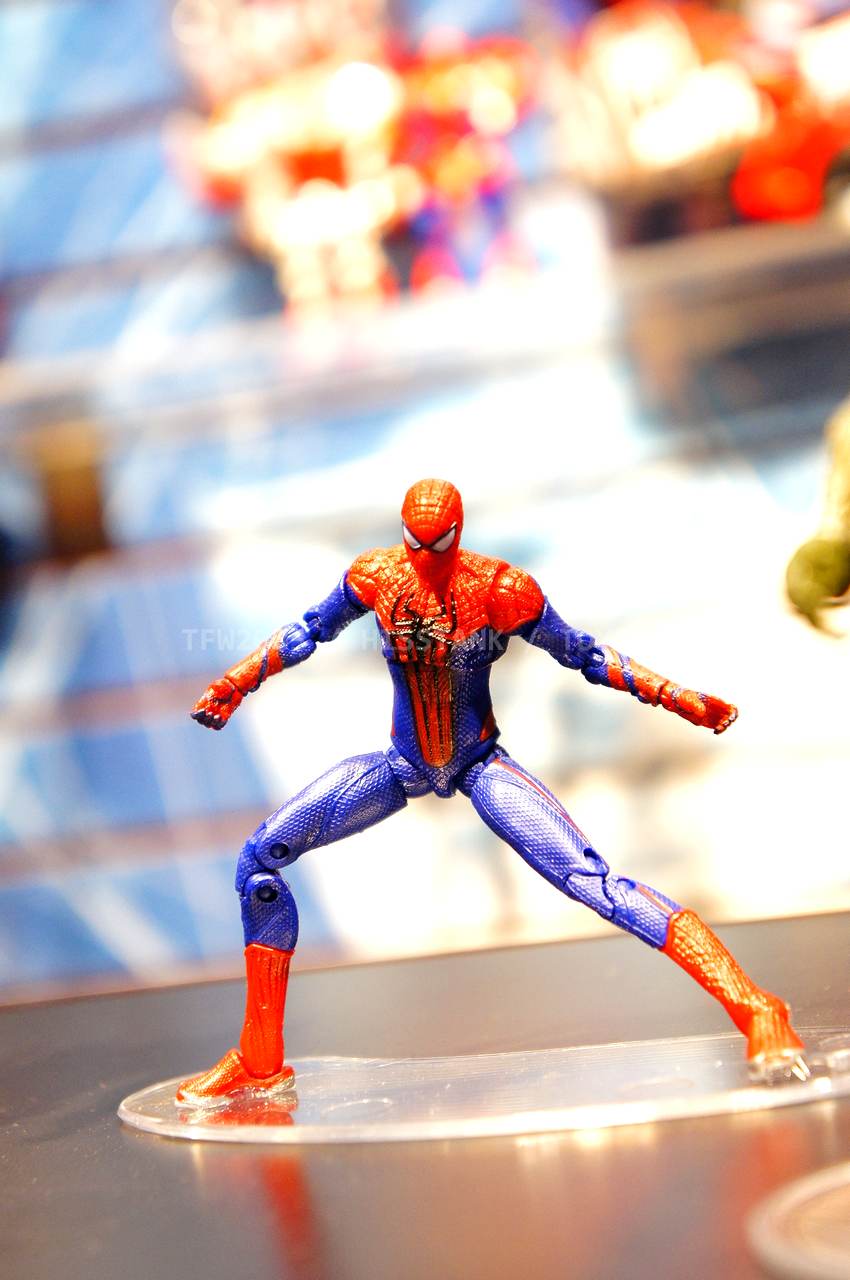 Check out images from the Hasbro show room of upcoming Spiderman movie figures. Nearly the entire line is aimed at kids, so for collectors, perhaps we’ll get something more suited to us shown at SDCC. The super articulated Spiderman shown last year at SDCC 2011, is shown here, in addition to a bunch of role playing items and figures with gimmicks. Nearly all of the single carded figures feature t-crotches in lieu of articulated hips. Will this line still be a hit with kids?