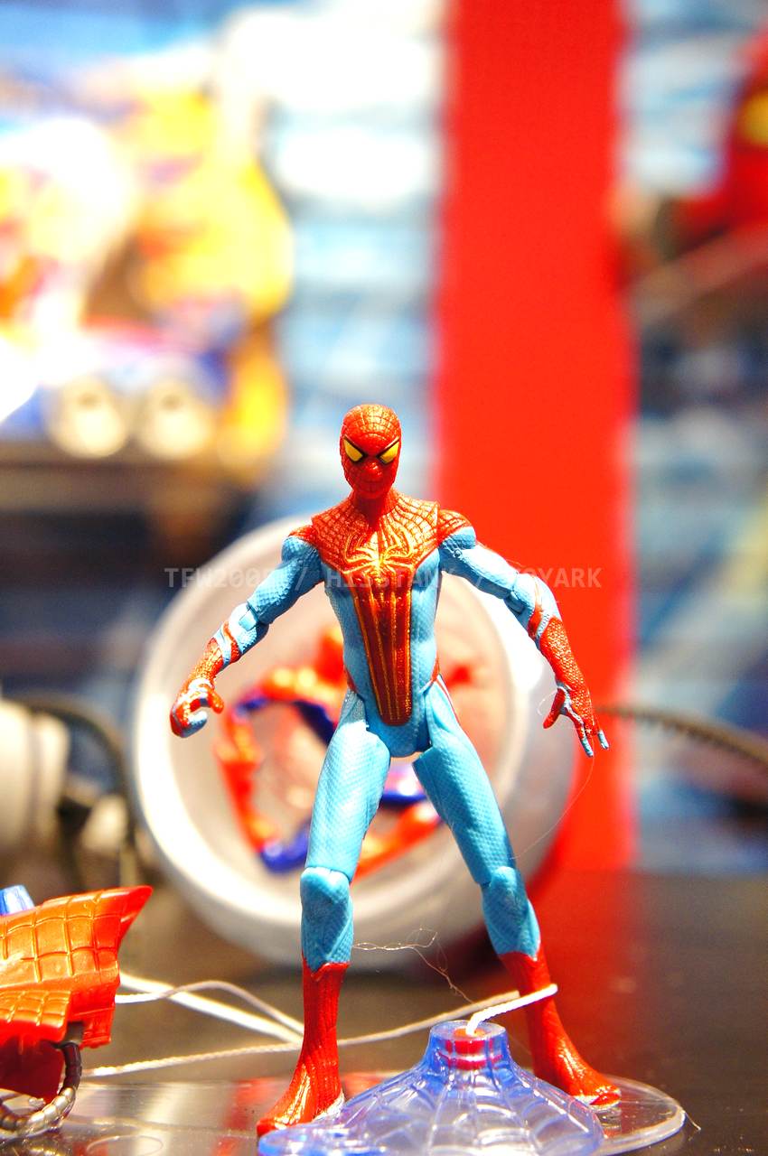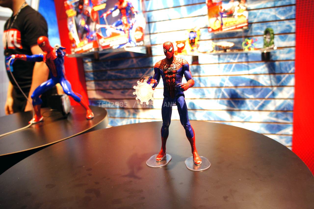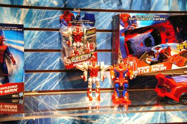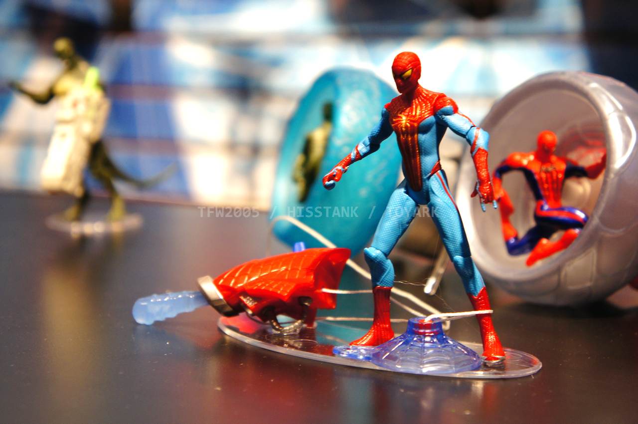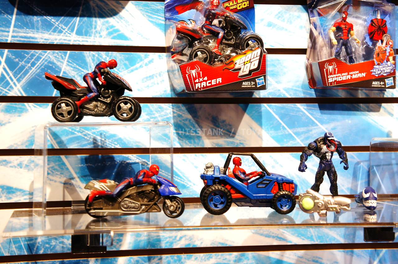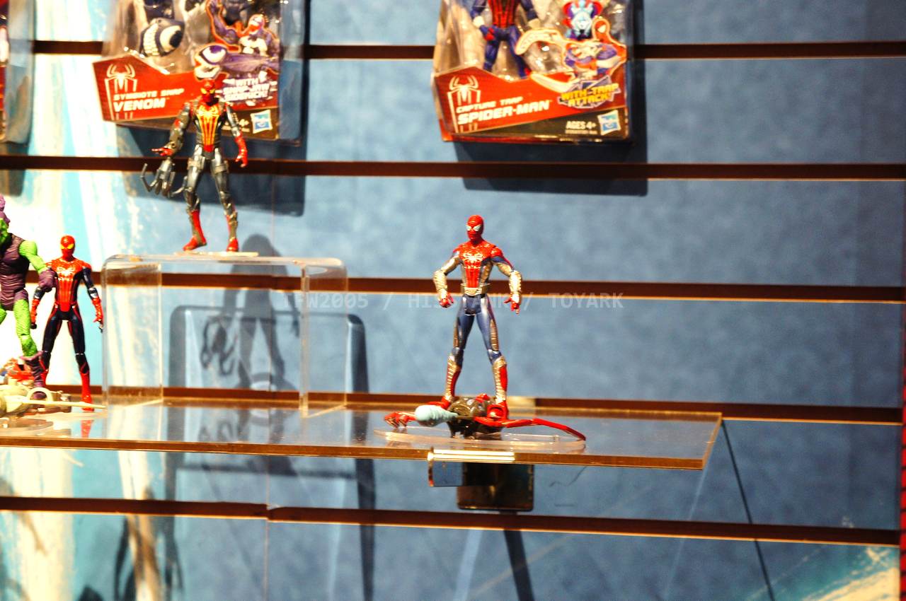 Check out images from the Hasbro show room of upcoming Spiderman movie figures. Nearly the entire line is aimed at kids, so for collectors, perhaps we’ll get something more suited to us shown at SDCC. The super articulated Spiderman shown last year at SDCC 2011, is shown here, in addition to a bunch of role playing items and figures with gimmicks. Nearly all of the single carded figures feature t-crotches in lieu of articulated hips. Will this line still be a hit with kids?