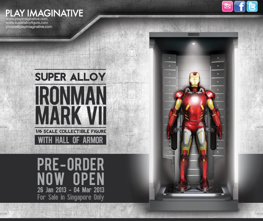 Play Imaginative has posted details, images and pre-order info for their upcoming Super Alloy Iron Man Mark VII. The figure also includes a Hall of Armor to display the figure. For pre-order info, Click Here.