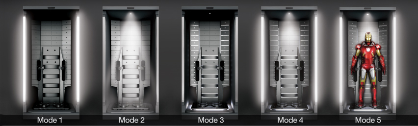 When the Iron Man Mark VII is positioned in the Hall of Armor, magnetised feet automatically activate lighting mode 5 for an impressive display.