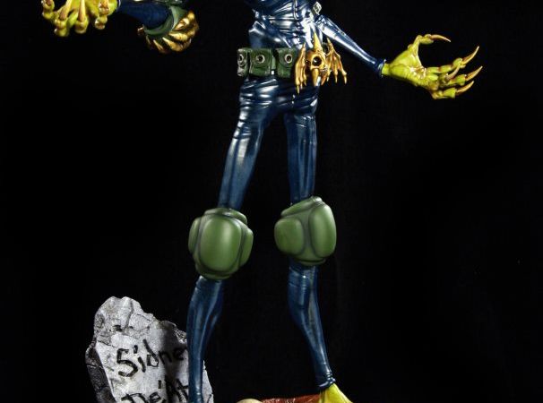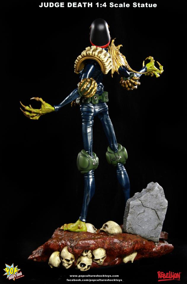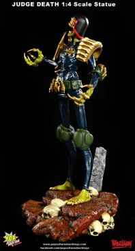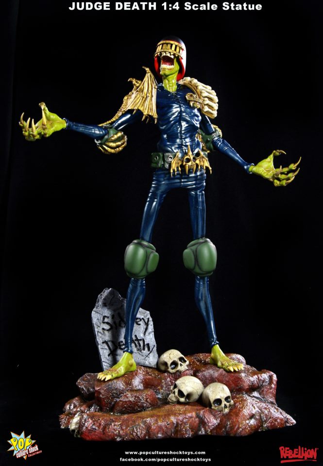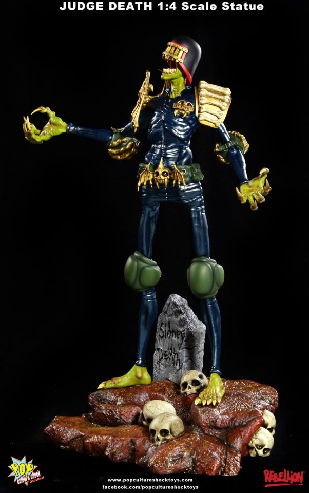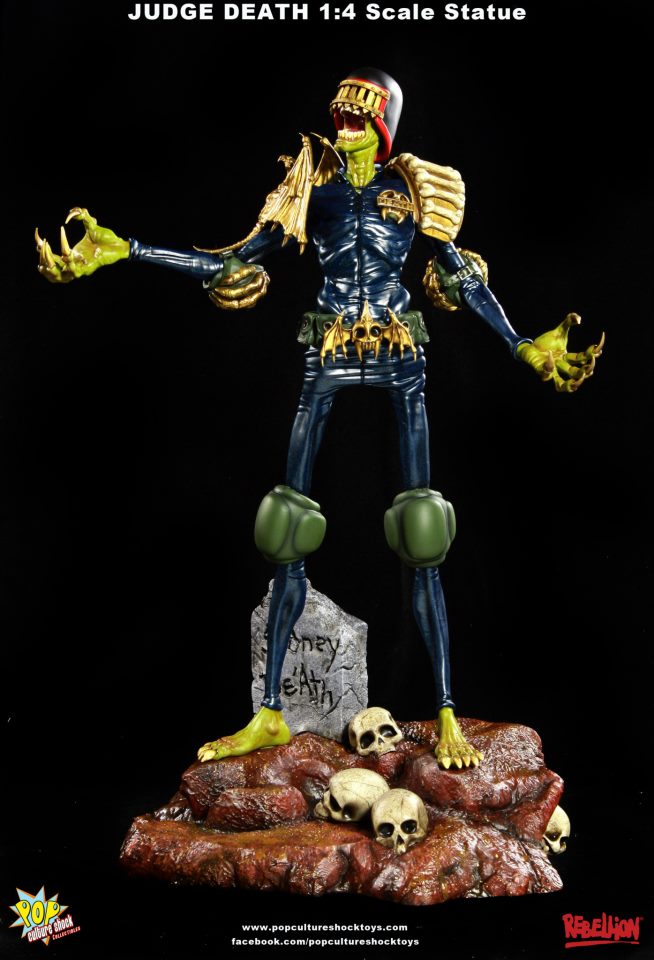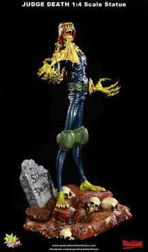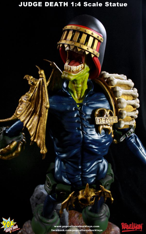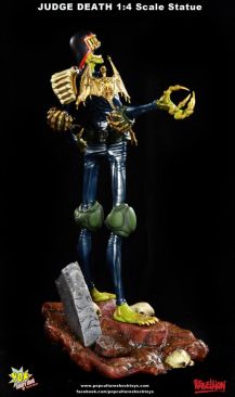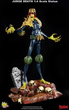 Pop Culture Shock Collectible brings us the final images for Judge Death It is 21″ tall limited to 275 pieces and priced at $360 USD. It includes interchangeble ‘smiling head’, ‘Judge Dredd helmet’ and ‘mohawk head’.