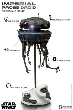 Sideshow has released photos and information for their upcoming Star Wars Imperial Probe Droid Sixth Scale Figure. The droid stands at 18″ tall and comes with a specialized figure base. The Imperial Probe Droid will also come with built-in sound effects (listen Here). Pre-orders go live this Thursday at a price of $249.99.