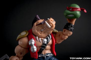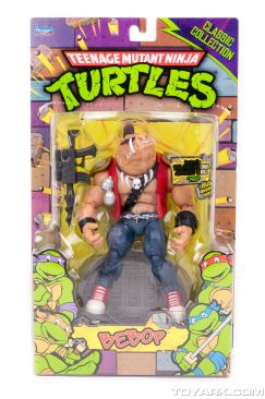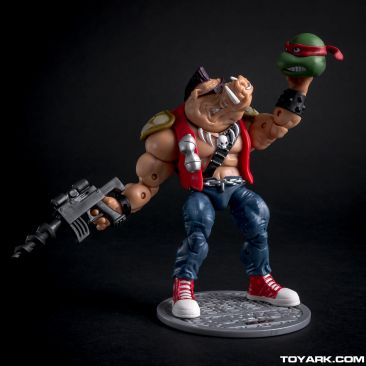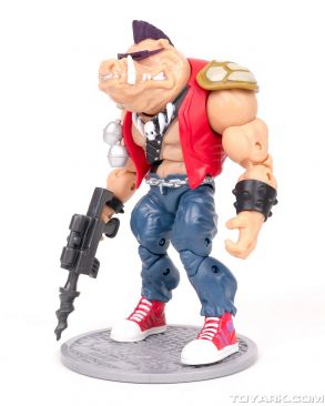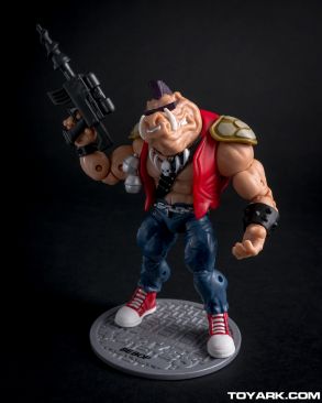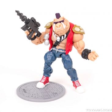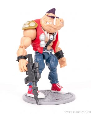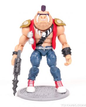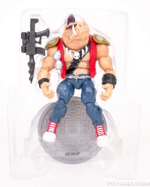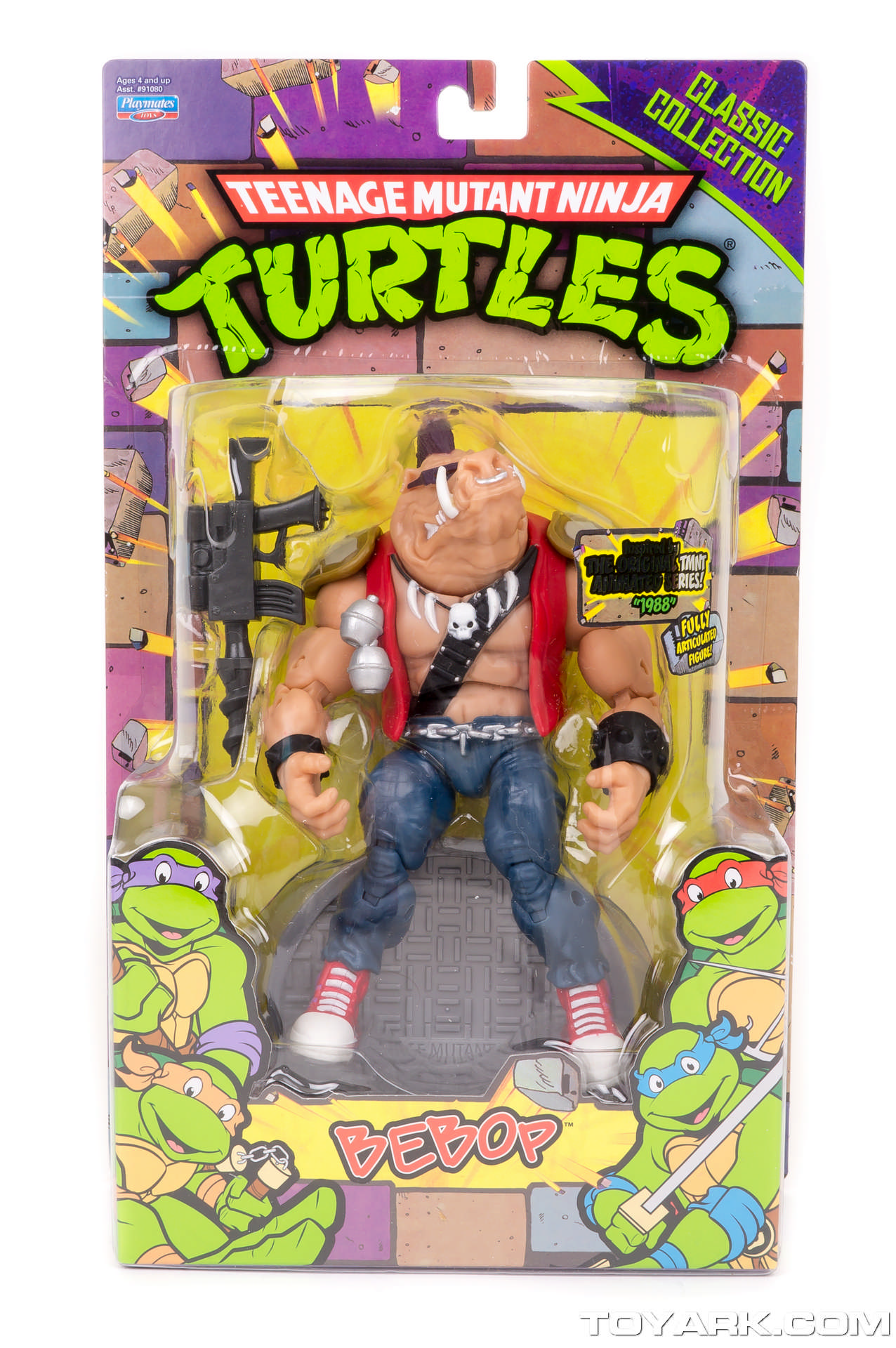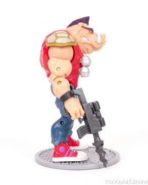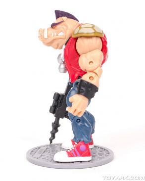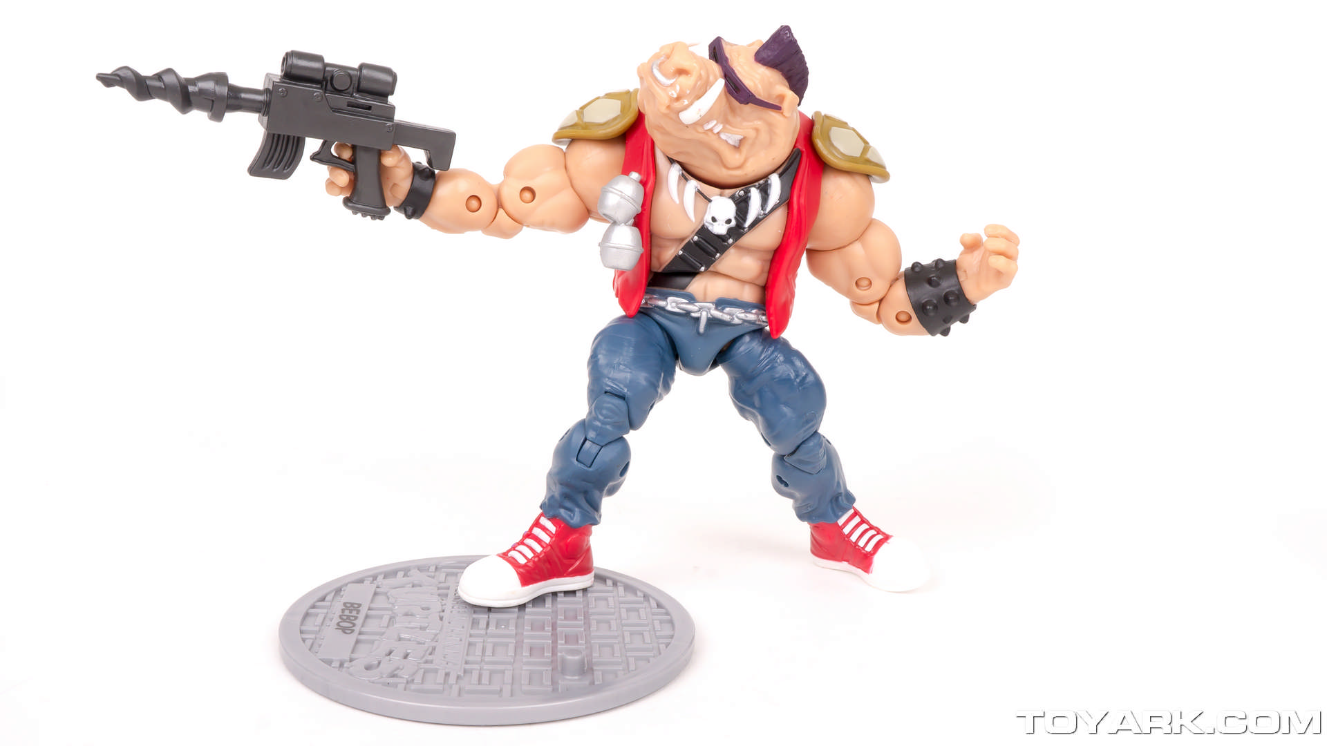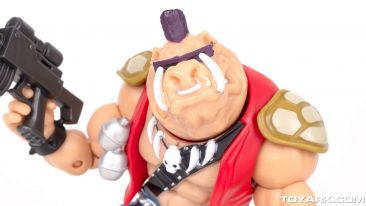 Bebop stands around 6.5 inches tall, perfectly in line with the 4 Classics Turtles from last year. He has a similar proportion to the original figure, with a heavy upper body and an over-sized head. All of the design cues are there – red vest, mohawk, cool 80s sunglasses, turtle shell armor, chain belt and the list goes on. Bebop has one weapon, his signature Shell-Drill gun, and it’s the only detachable or removable part. Everything else is molded on. The plastic quality is nice, figure has a quality heft to it. Paint applications are well done, but there was some splatter on my particular piece on the face. Articulation is overall good, the double jointed elbows work really well. However, he is a bit bow-legged due to restricted hip joints, and does not come with ankle articulation at all. This limits his posability a bit compared to the turltes but I wouldn’t say it’s a deal breaker. There is limited movement in all directions for the head as well – he has a big noggin. Posing there mostly consists of left/right and he always seems to be looking up. Again, not a deal breaker as they are keeping in line with the original figure’s traits.