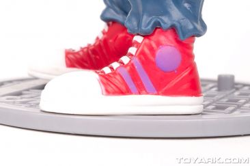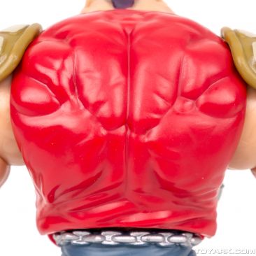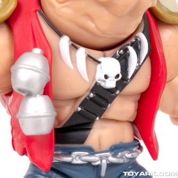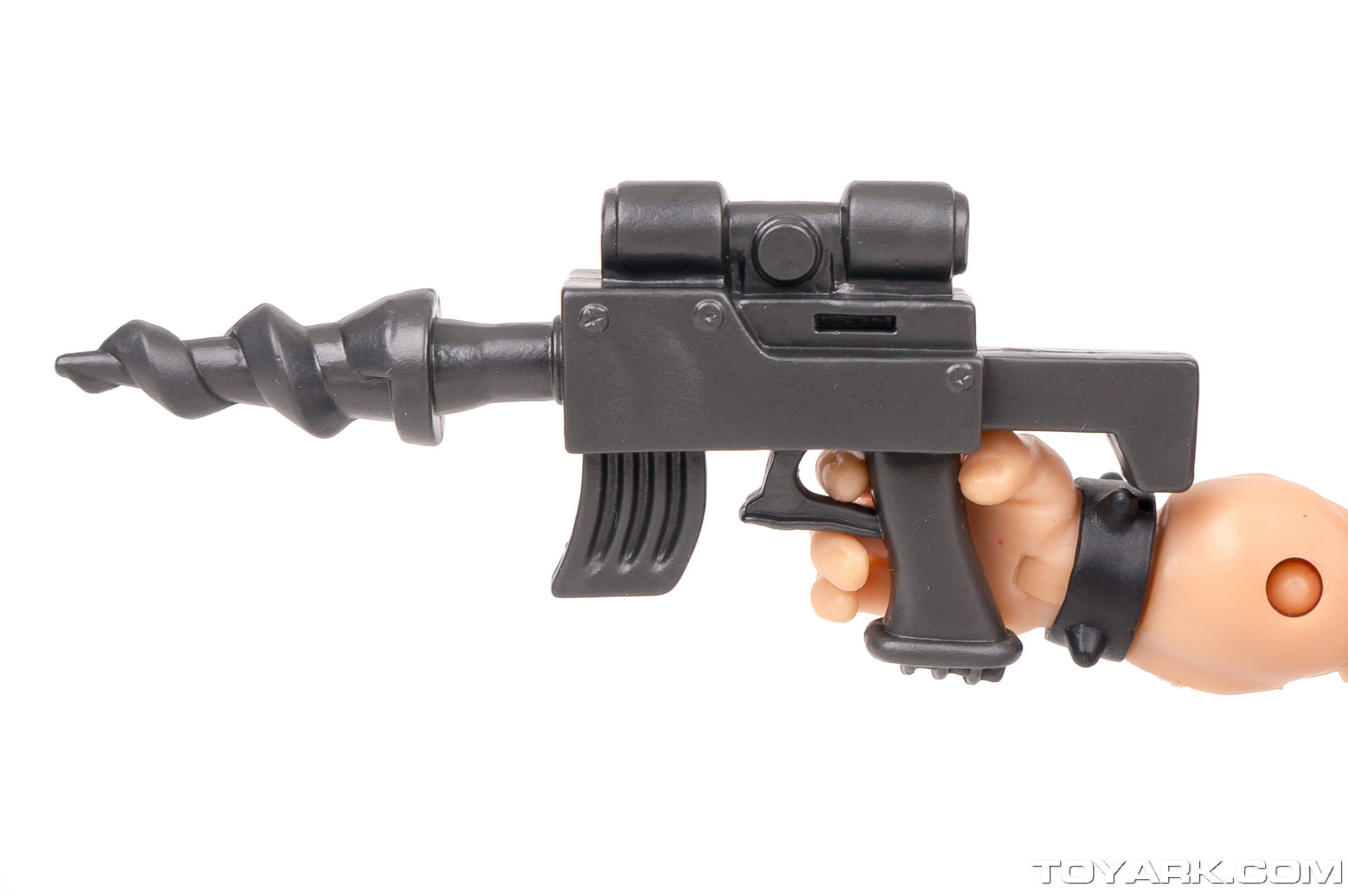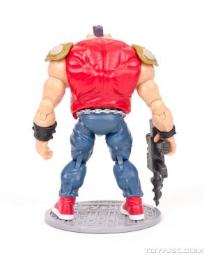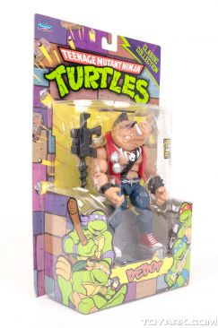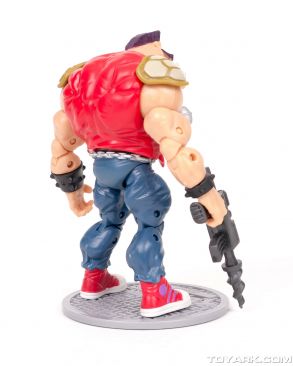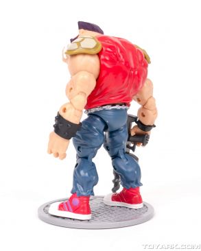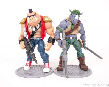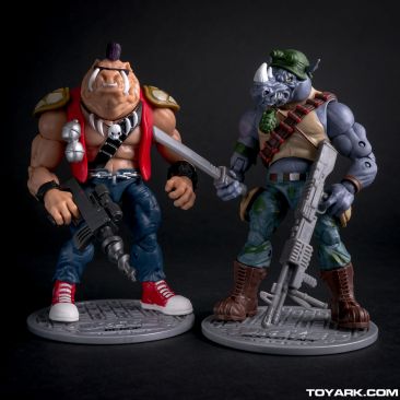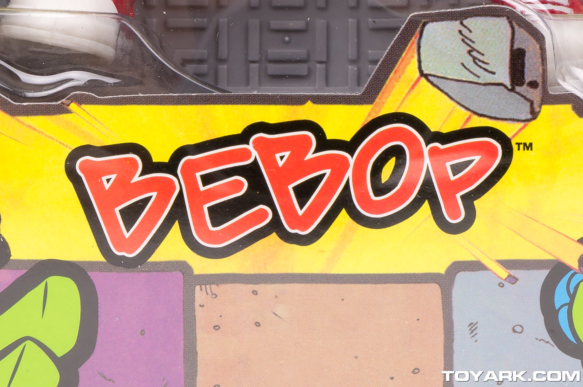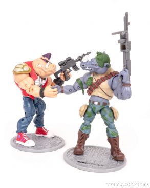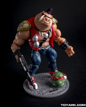Bebop stands around 6.5 inches tall, perfectly in line with the 4 Classics Turtles from last year. He has a similar proportion to the original figure, with a heavy upper body and an over-sized head. All of the design cues are there – red vest, mohawk, cool 80s sunglasses, turtle shell armor, chain belt and the list goes on. Bebop has one weapon, his signature Shell-Drill gun, and it’s the only detachable or removable part. Everything else is molded on. The plastic quality is nice, figure has a quality heft to it. Paint applications are well done, but there was some splatter on my particular piece on the face. Articulation is overall good, the double jointed elbows work really well. However, he is a bit bow-legged due to restricted hip joints, and does not come with ankle articulation at all. This limits his posability a bit compared to the turltes but I wouldn’t say it’s a deal breaker. There is limited movement in all directions for the head as well – he has a big noggin. Posing there mostly consists of left/right and he always seems to be looking up. Again, not a deal breaker as they are keeping in line with the original figure’s traits.