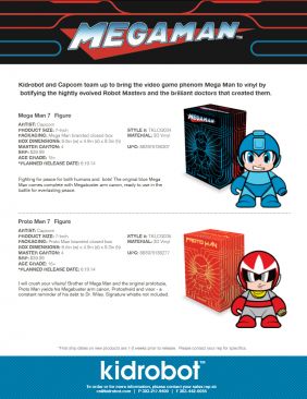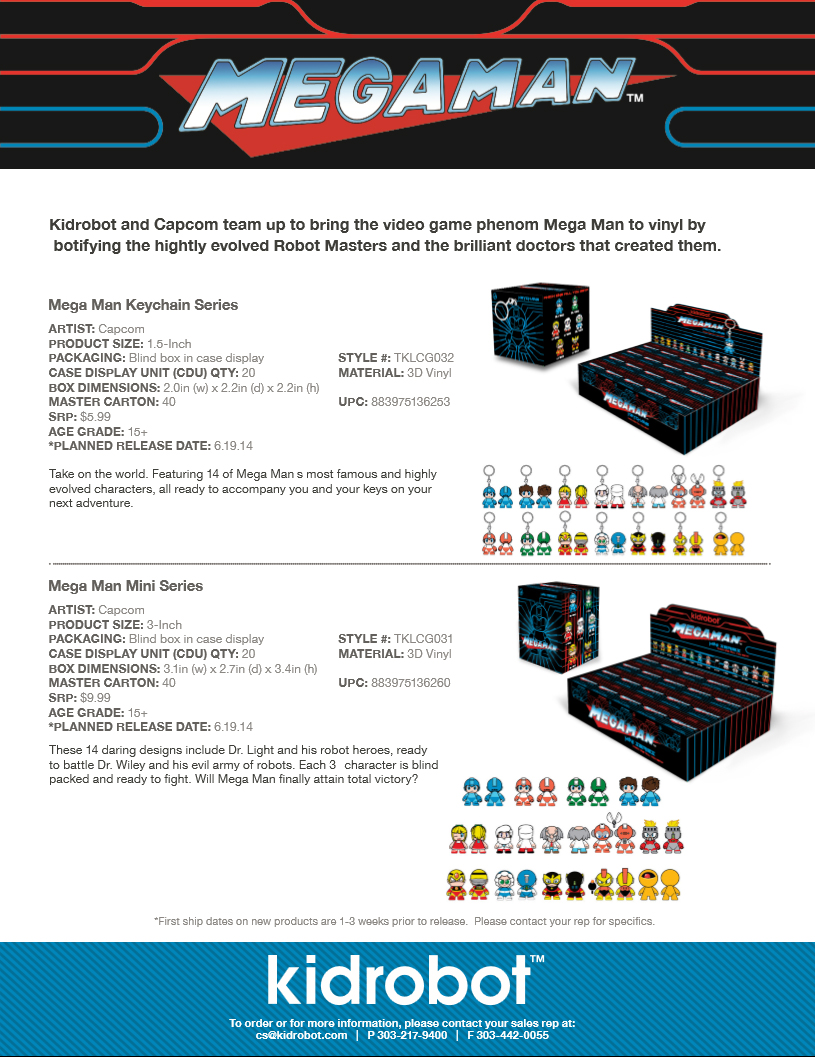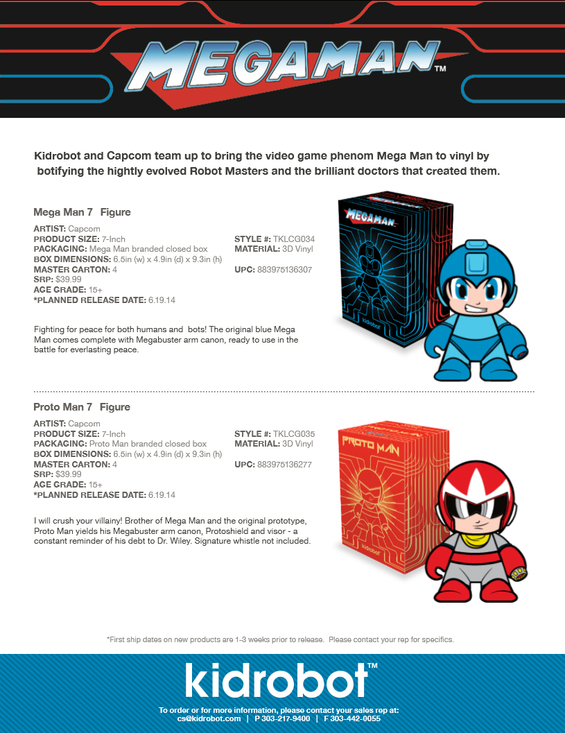 Kidrobot has announced a new line of Mega Man Vinyl Figures. A post on their Facebook page reveals a single promo image. However, the folks over at Destructoid have much more. They have design images for the entire lineup as well as product info. There will be a series of Mega Man Blind Boxed 4″ Figures, a series of figures on keychains as well as 7″ versions of Mega Man and Proto Man. The smaller figures and keychains will be $9.99 each, while the 7″ figures will be $39.99 each.