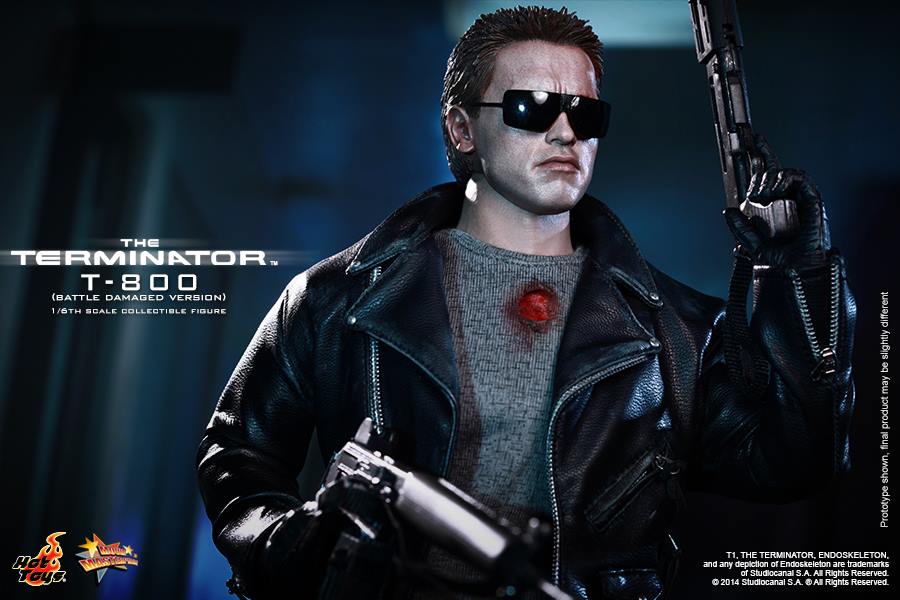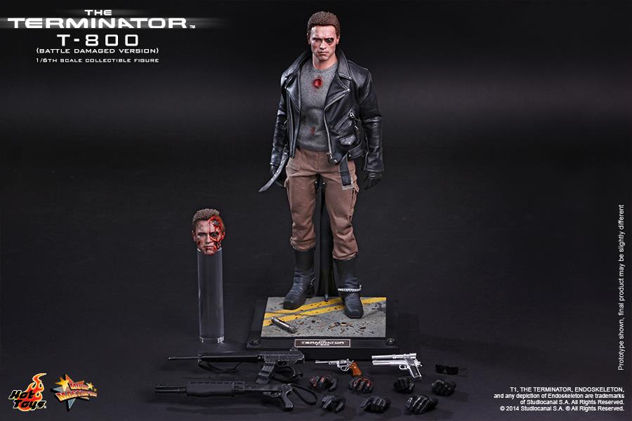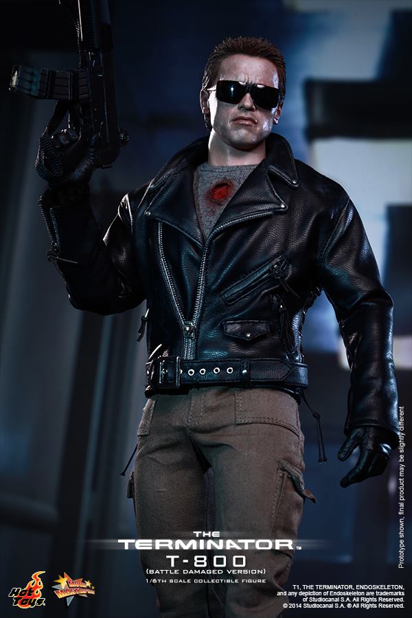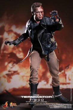 The T-800 collectible is specially crafted based on the image of Arnold Schwarzenegger in battle damaged look from the movie featuring two battle damaged head sculpts with red LED light up left eyeball, leather-like jacket, as well as detailed weapons and a specially crafted diorama figure base.