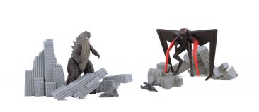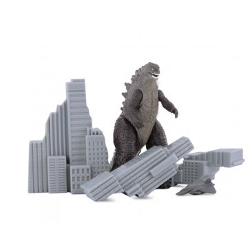 Bring the excitement of Legendary Pictures’ Godzilla home with this deluxe “Destruction Pack”. Set includes Godzilla and Muto figure, plus three (3) destructible buildings, one (1) collapsible bridge, and five (5) military vehicles.