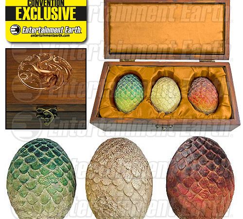 Entertainment Earth dropped us a line and gave us an exclusive first look at an upcoming convention exclusive due out this summer! They will be selling a limited run of the Game of Thrones Dragon Egg Prop Replica Set in Wooden Box by Artisan Designs. This new limited run will feature a gold satin liner and a gold Targaryen three-headed dragon sigil on the box. The set is limited to 500, and will be hand numbered on the bottom. This item will first be sold at San Diego Comic-Con 2014 at the Entertainment Earth Booth #2343. If supplies remain after the show, retail orders will be filled and shipped then, during the first week of August, 2014. You can check their product page for it here.