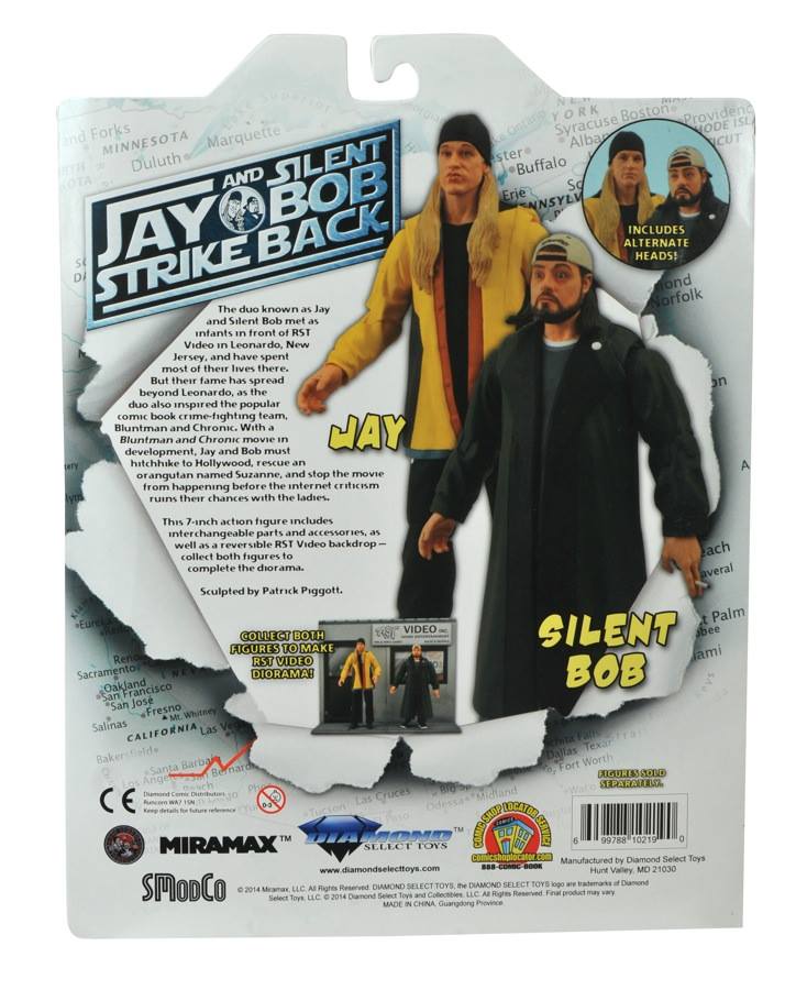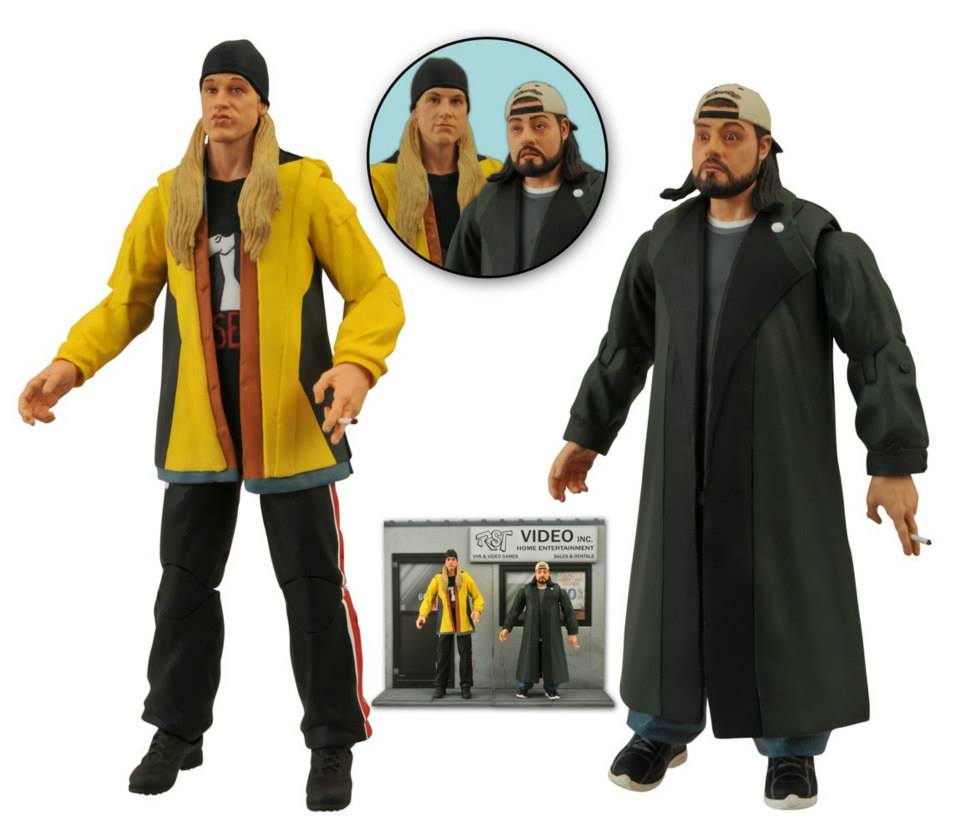 A Diamond Select Toys Release! It’s been 20 years since we met Jay & Silent Bob in Clerks, and DST is celebrating the less-than-dynamic duo’s anniversary with their most realistic action figures ever! Based on their appearances in Jay & Silent Bob Strikes Back, these 7-inch scale figures include multiple interchangeable parts, multiple points of articulation, and connecting display bases depicting the interior and exterior of RST Video. Packaged in Select-style display packaging, with spine artwork