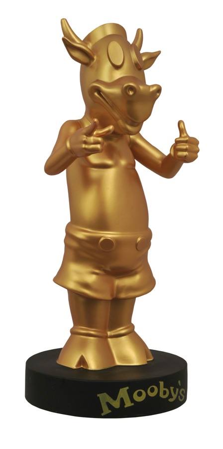 A Diamond Select Toys release! Who’s a friend to the king of all the monkeys? Who’s a pal to the duck who won’t fly south? It’s Mooby the Golden Calf! We’ve turned our 10-inch vinyl bank of director Kevin Smith’s fast-food mascot and children’s entertainment fixture into a true idol! With a new, all-gold paint job, a coin slot, and an access door underneath to dispense your spare change, he truly is a Golden Calf! Comes packaged in a clear polybag. (Item #JAN152169, SRP $22.99)