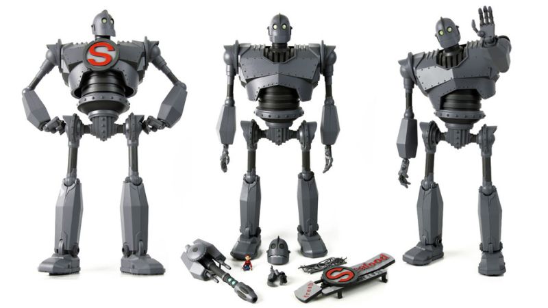 Mondo‘s awesome Iron Giant figure is getting ready to go on pre-sale. The pre-order page is scheduled to go up later today at MondoTees.com. The massive figure features over 30 points of articulation, interchangeable heads, a magnetic “S” for the chest, an interchangeable War Arm, a Hogarth miniature figure, and a metal girder. A special limited version will include the detached hand from the film.