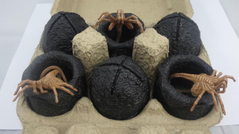 Here’s another catch up post from my little hiatus the past few days. On Friday, NECA previewed the awesome packaging for their upcoming Alien Eggs and Facehugger Set. They are working on an actual egg carton for the packaging. It will include a total of six eggs. Some opened, some closed, with a few Facehuggers thrown in for good measure. We’ll share more images and info when they become available.