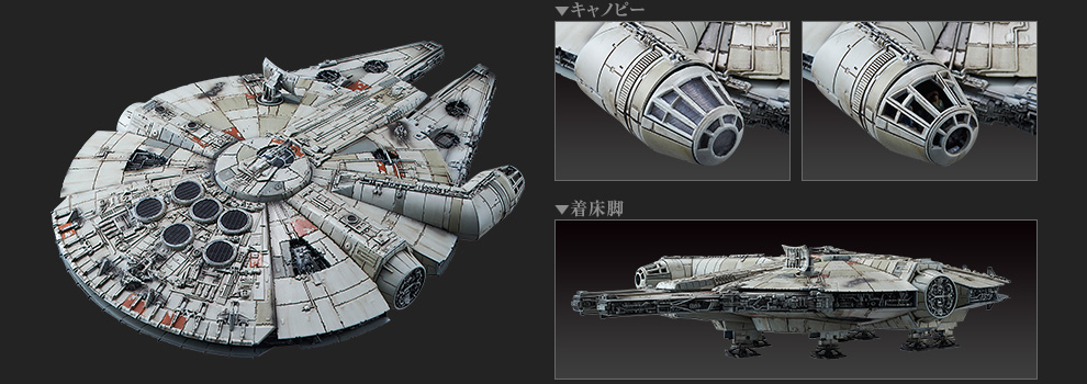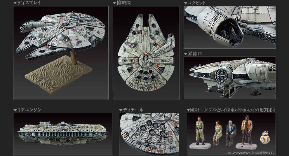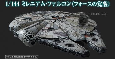 Finally, the 1/144 Scale Millennium Falcon will also come unassembled, but pre-painted. It will include its own decals. It will include a canopy that opens, engine effects pieces, a display stand, and multiple scaled figures. The figures are Han Solo, Rey (standing and Seated), Finn, and BB-8. This will be available in October at a price of 5,400 Yen (about $45 USD).