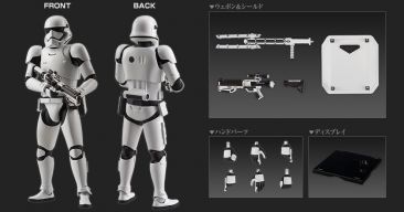 The First Order Stormtrooper 1/12 Scale Model Kit will require assembly and will have decals, but not require painting (unless you want to add your own details). It will include interchangeable hands, a shield, a tonfa stick, a blaster and a figure stand. It’s scheduled for release in November at a price of 2,592 Yen (about $21 USD).
