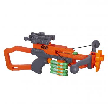 The fight to restore order to the galaxy comes home with the first-ever STAR WARS NERF blasters! Battle against the FIRST ORDER in the style of your favorite WOOKIEE with this blaster that features a removable scope, real crossbow action and five NERF darts that fire up to 65 feet!