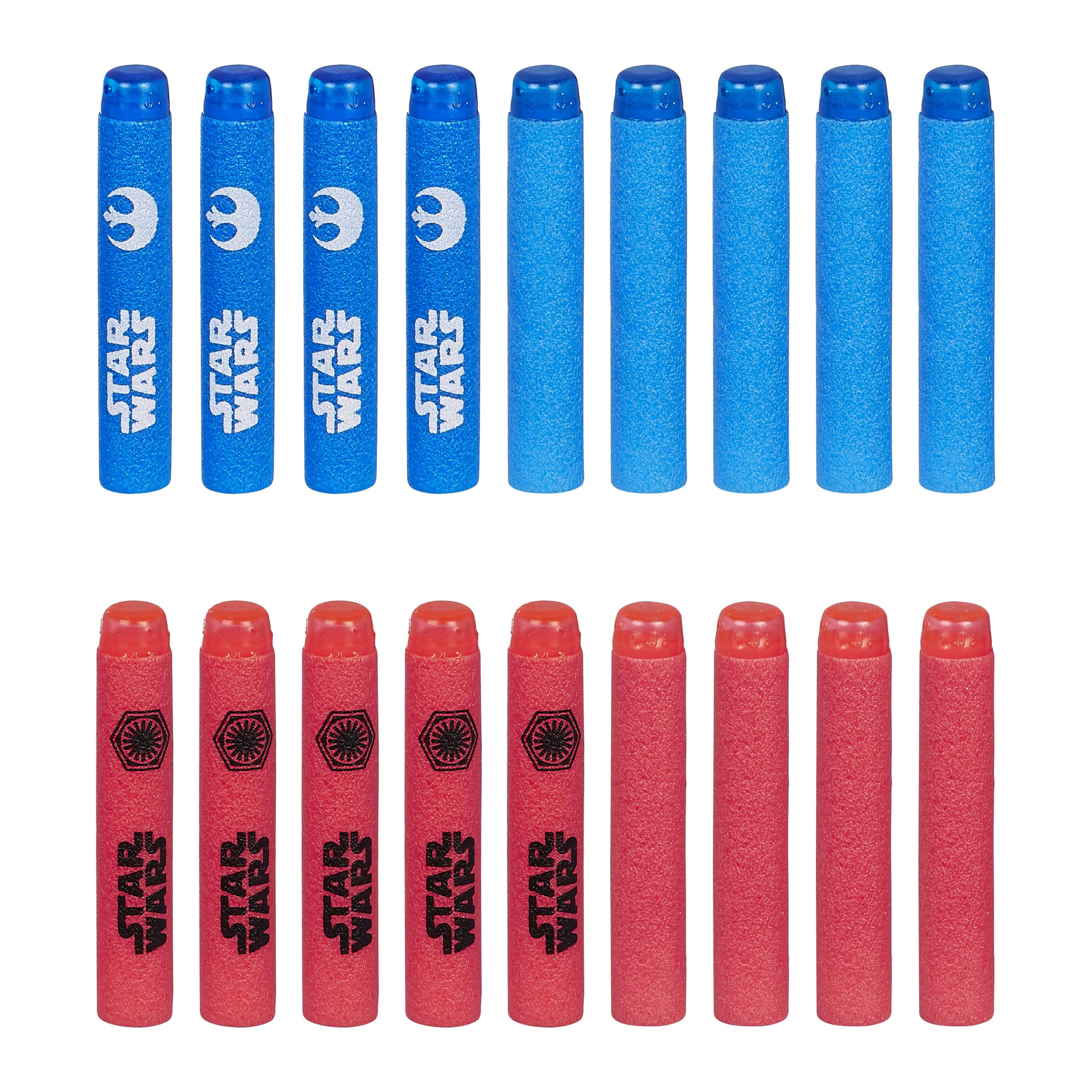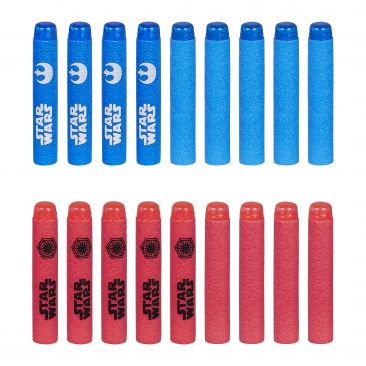 The fight to restore order to the galaxy comes home with the first-ever STAR WARS NERF blasters! Choose your side – RESISTANCE blue or FIRST ORDER red – and blast into battle! Each refill pack comes with 18 foam NERF darts compatible with all STAR WARS NERF blasters, sold separately.