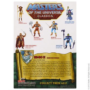 After He-Man returned to Eternia following the apparent defeat of Skeletor, he at long last wed his childhood friend and sweetheart Teela. Together they ruled over a peaceful Eternia, free at last from the factions that had fought over it for so long. But in his distant dimensional prison, the Unnamed One re-amassed power. With the help of Evil-Lyn’s son, he was released and struck out against guardians of the Sword of He. Dare, the teenage son of Adam and Teela, took his rightful place and claimed his father’s sword, becoming the new He-Ro, named for the legendary Wizard Warrior of Preternia. Using the Sword of Power, He-Ro fought the Unnamed One, eventually slaying him with the very power he once sought to control.
