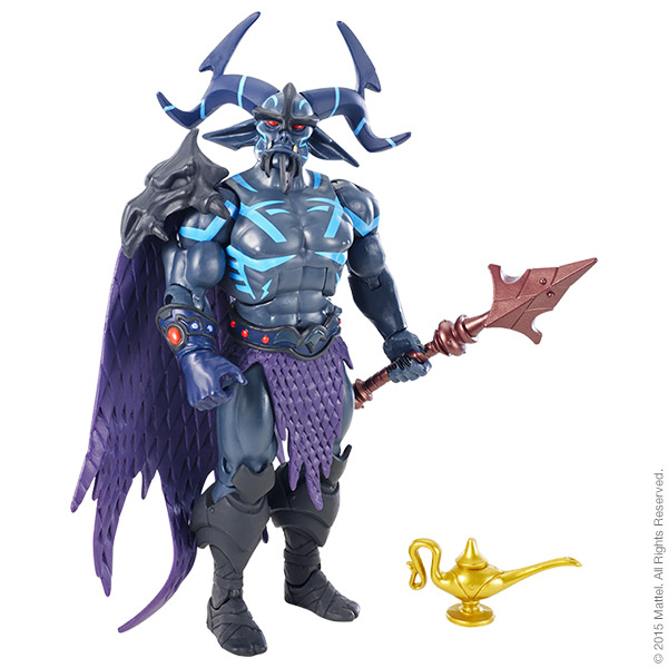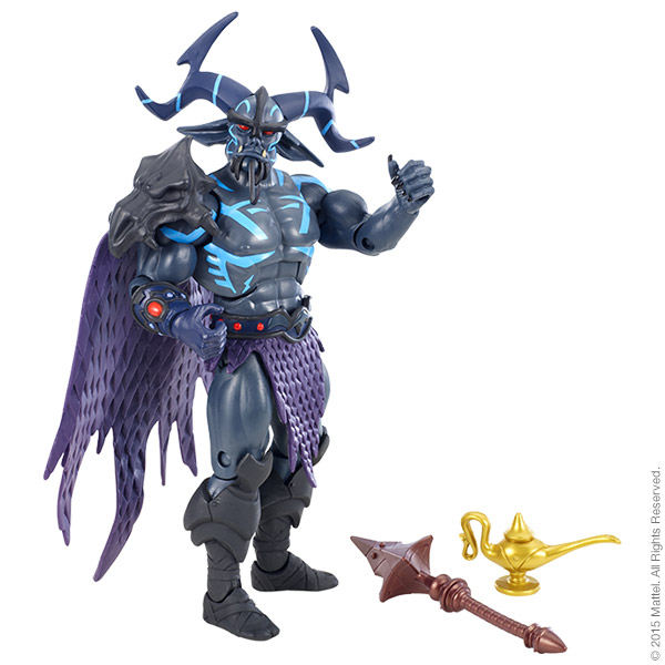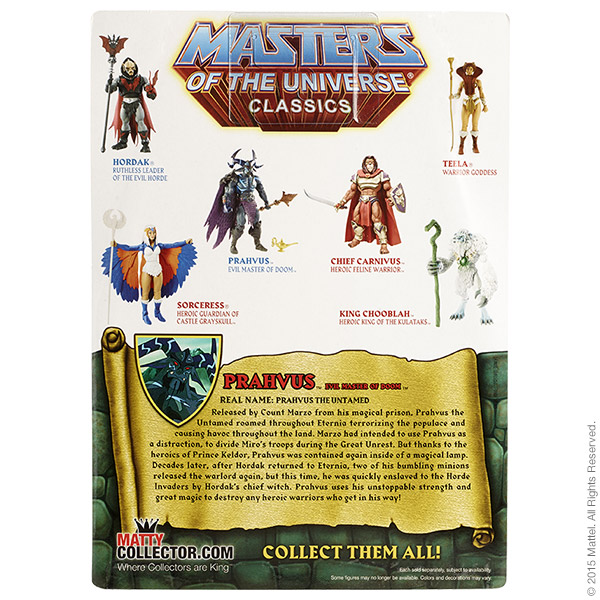 Released by Count Marzo from his magical prison, Prahvus the Untamed roamed throughout Eternia terrorizing the populace and causing havoc throughout the land. Marzo had intended to use Prahvus as a distraction, to divide Miro’s troops during the Great Unrest. But thanks to the heroics of Prince Keldor, Prahvus was contained again inside of a magical lamp. Decades later, after Hordak returned to Eternia, two of his bumbling minions released the warlord again, but this time, he was quickly enslaved to the Horde Invaders by Hordak’s chief witch. Prahvus uses his unstoppable strength and great magic to destroy any heroic warriors who get in his way!