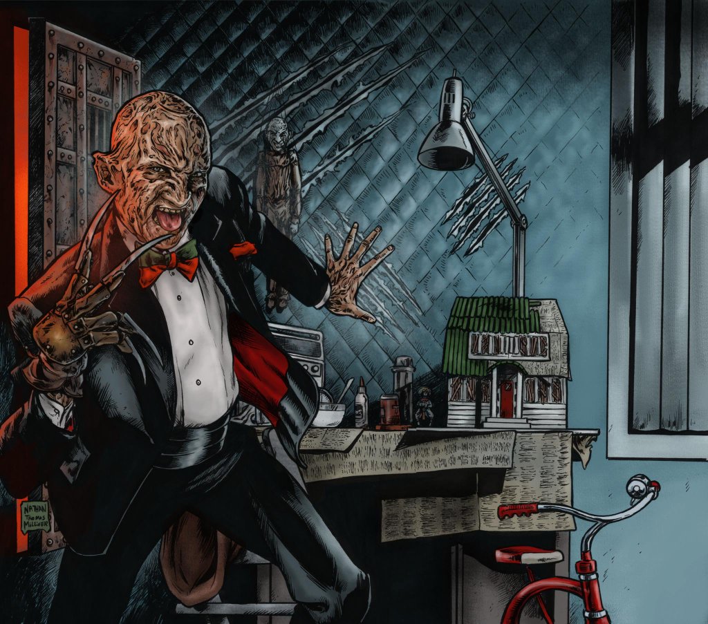 NECA has teased their next retro Mego style Freddy Krueger. They are releasing the “Tuxedo” Freddy as seen in A Nightmare On Elm St 3: The Dream Warriors. The artwork was created by Nathan Thomas Milliner. You can see much more of his work Here. We’ll have more details as they become available.