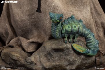 The Force is strong with this one! Capturing Luke Skywalker’s wise and powerful mentor in astonishing detail, Master Yoda appears in his meticulously tailored Jedi robes, resting serenely against his cane as he contemplates the mysteries of the Force. Sideshow’s artists have perfectly captured the magic of Frank Oz’s original puppet in this magnificent true-to-life statue, with features so realistic that you’ll expect him to spring to life at any moment. Standing 32 inches tall on a Dagobah themed environment base (complete with colorful morp critter), Sideshow’s life-size Yoda replica is a dream come true for any Star Wars collector!