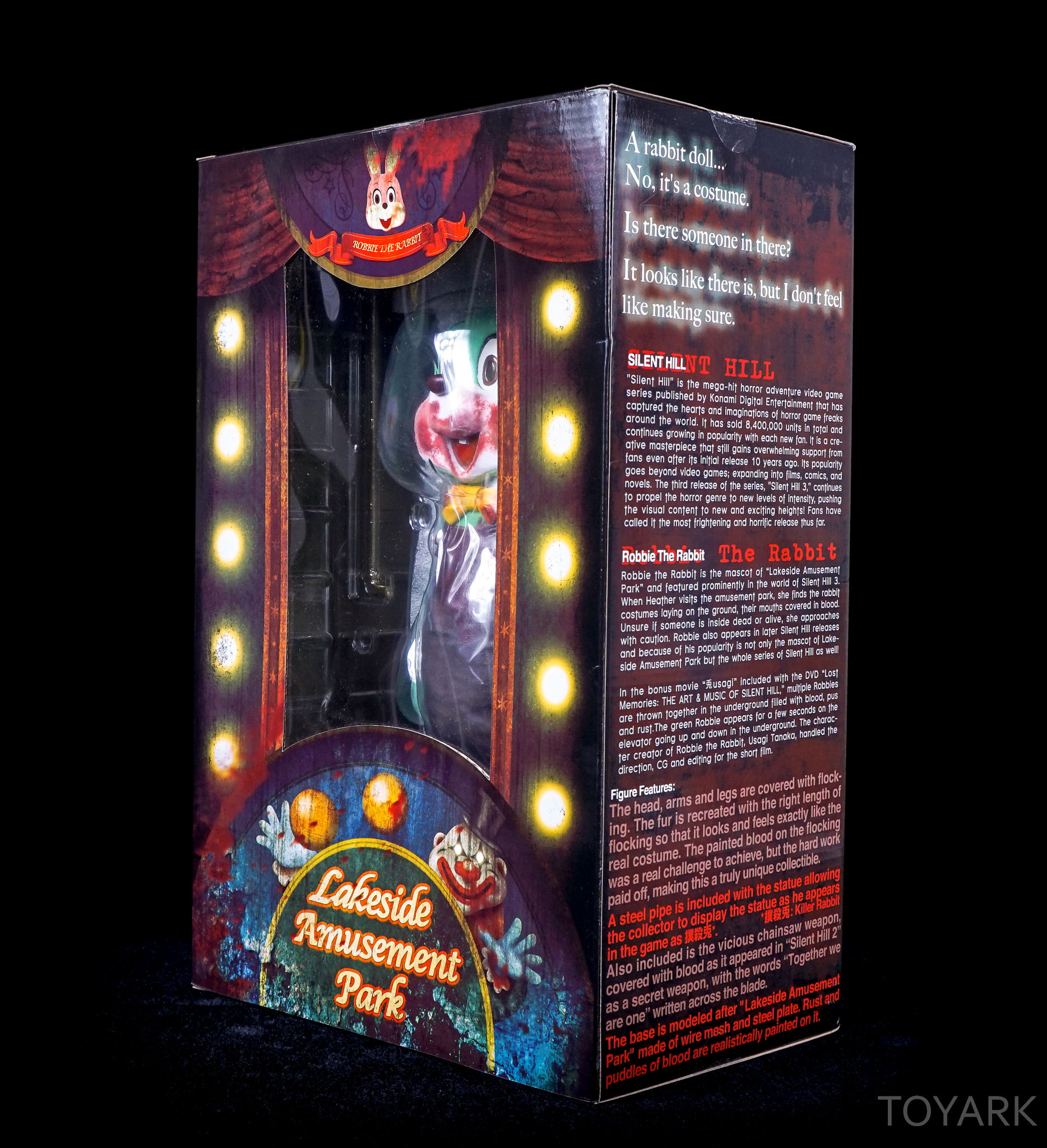 Robbie comes packaged in a stylish and eerie window box. The box is modeled after an attraction feature for Lakeside Amusement Park. On one side of the box is information on the history of Silent Hill and Robbie the Rabbit. The statue sits inside a resealable clamshell tray. The statue requires very minor assembly. You need to attach Robbie to the base, and then can choose whether to display him with the chainsaw, the steel pipe or without any weapon. Also in the package is a diorama backdrop featuring a map of Silent Hill.