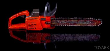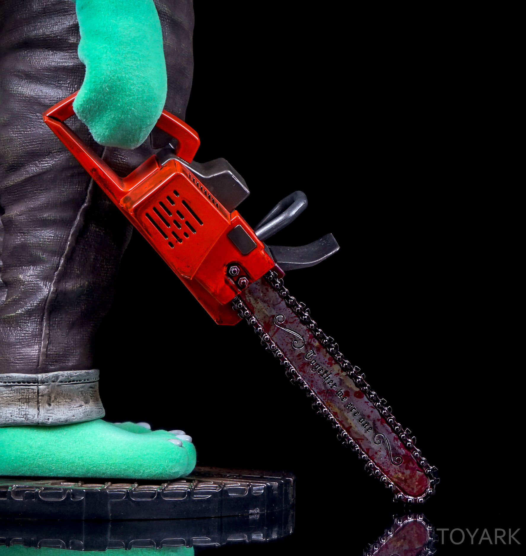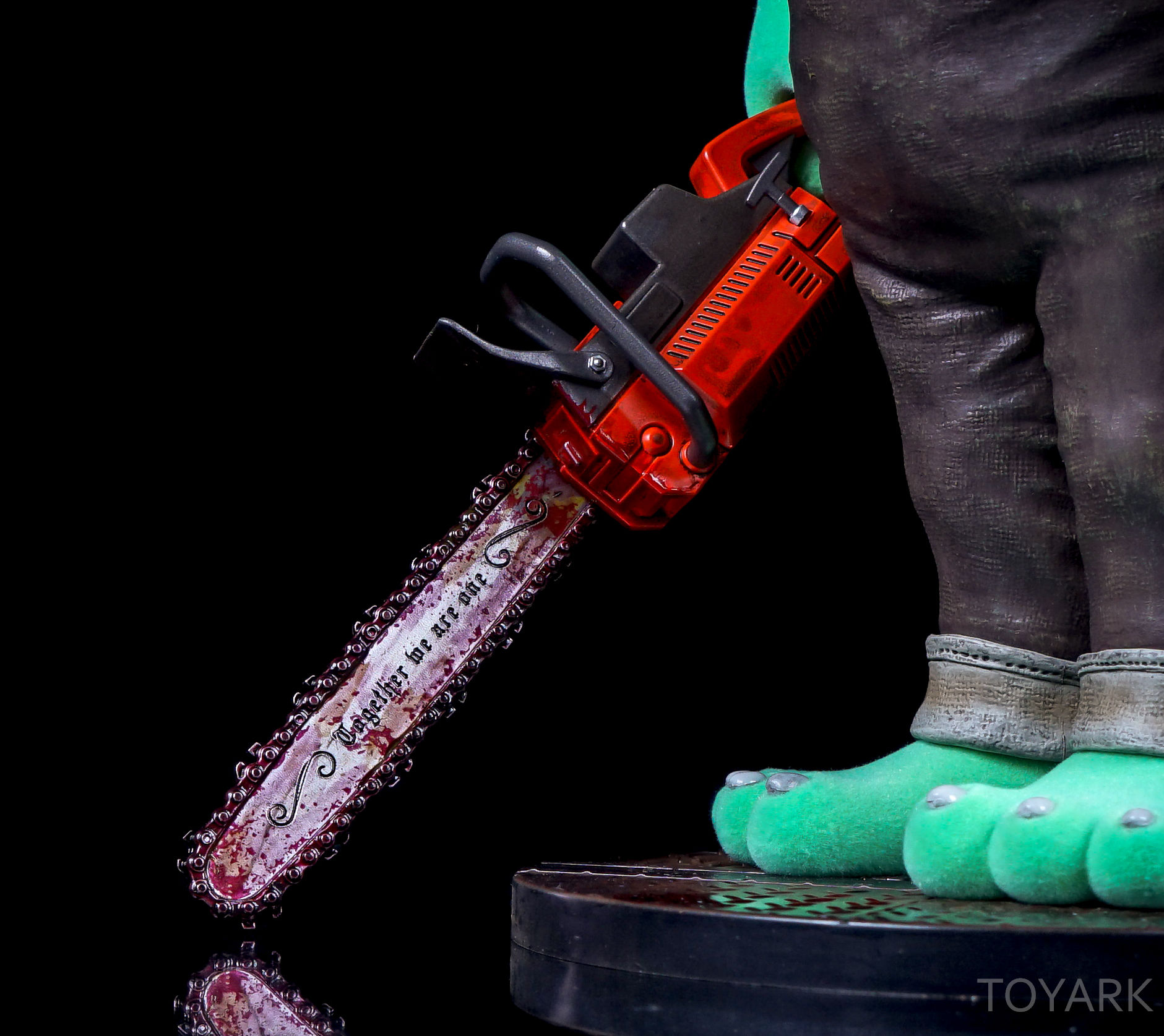 The sculpt itself is great, matching the game almost perfectly. There are a lot of nice touches, such as folds and wrinkles in the costume, making it look like someone is wearing it. The overalls have a realistic dungaree texture to them.. with the buttons having a nice metallic sheen. The thing that turns this statue from cut to creepy is the large amount of blood splatter here. The huge smear across its smiling face and splatters on his tie and overalls is enough to make your stomach turn. While the pipe is simply a vac metal piece of PVC, the chainsaw is filled with extremely intricate details.