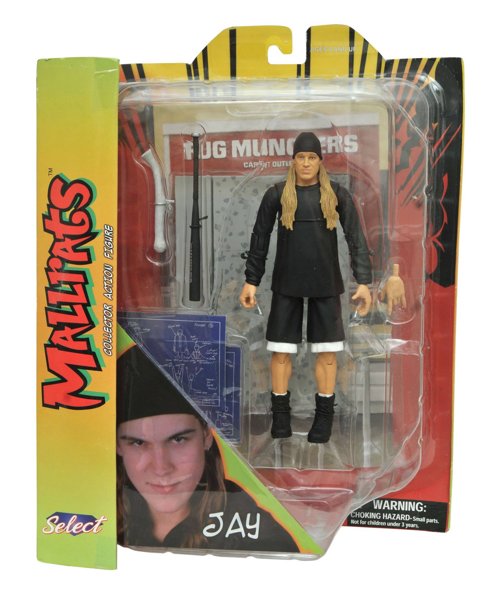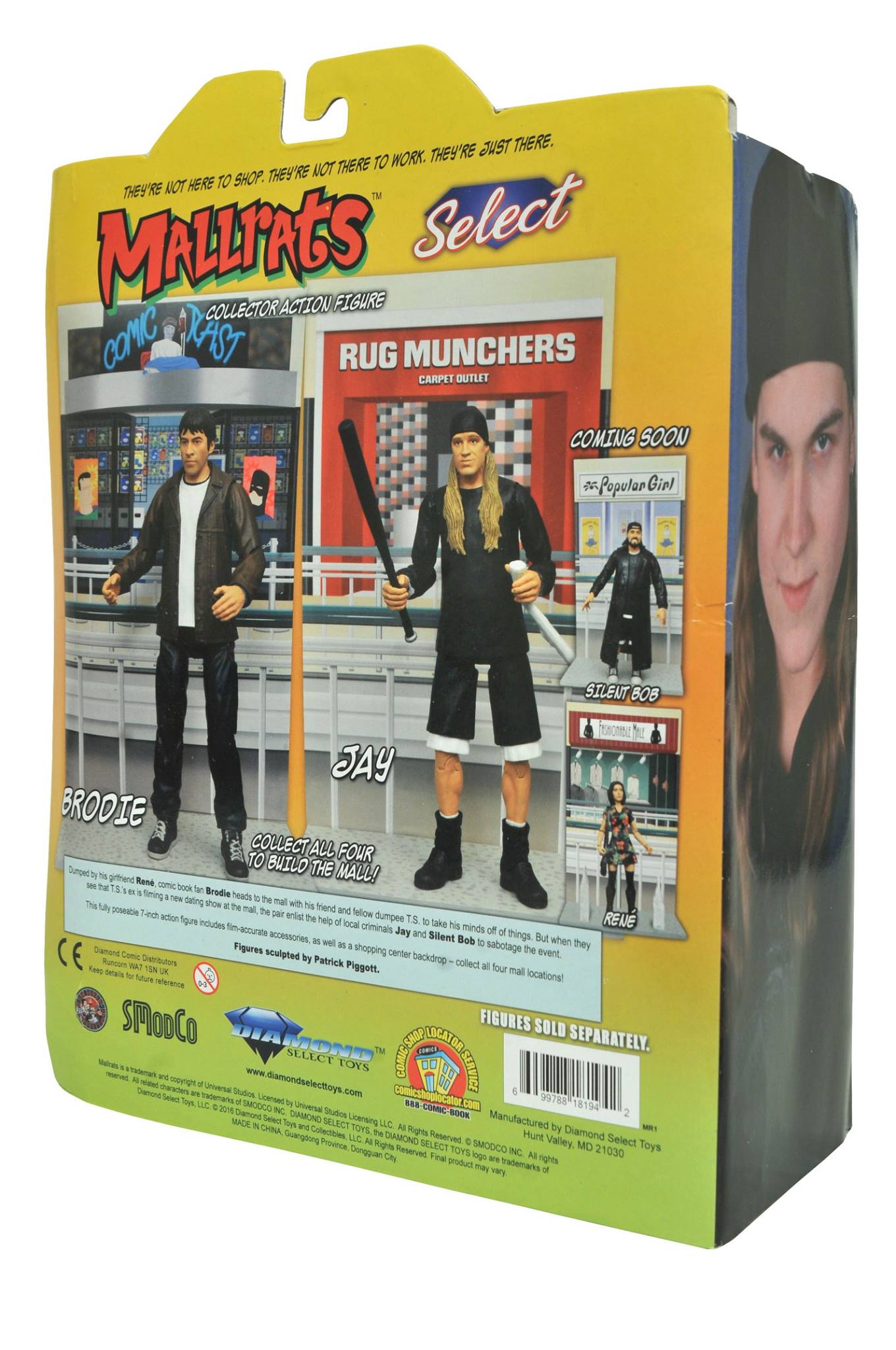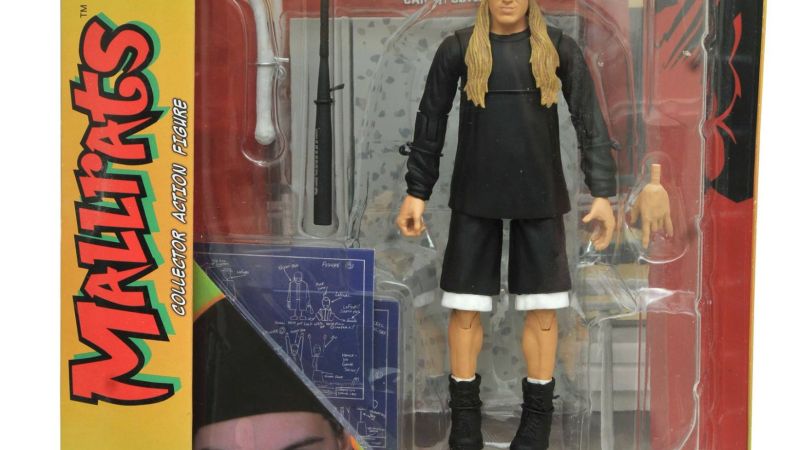Finally, after 22 years, fully poseable action figures of the cast of Kevin Smith’s sophomore(ic) masterpiece Mallrats have arrived! Jay and Brody are the first two in the series, each with character-specific accessories – sock full of quarters and baseball bat for Jay; chocolate pretzel and giant cookie for Brodie – as well as diorama bases depicting different stores in the mall! Each figure features approximately 16 points of articulation and the actor’s likeness. Packaged in display-ready Select packaging, with spine artwork for shelf reference. Sculpted by Patrick Piggott!