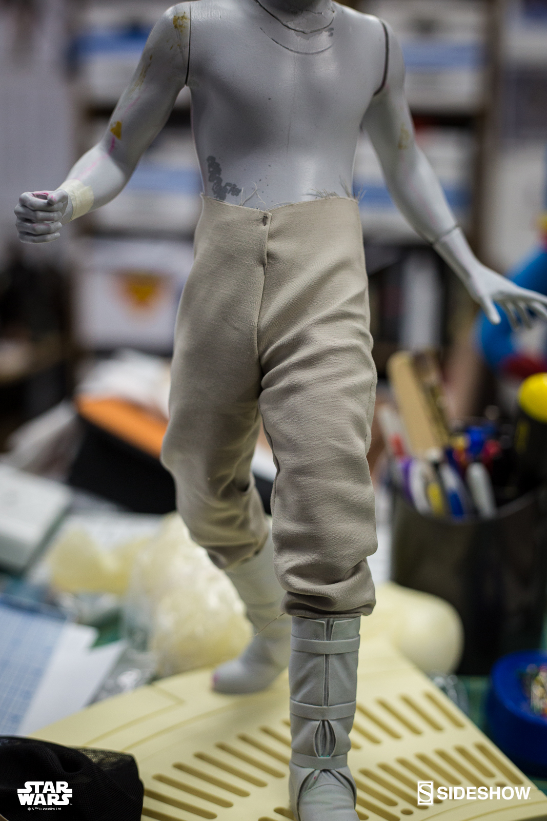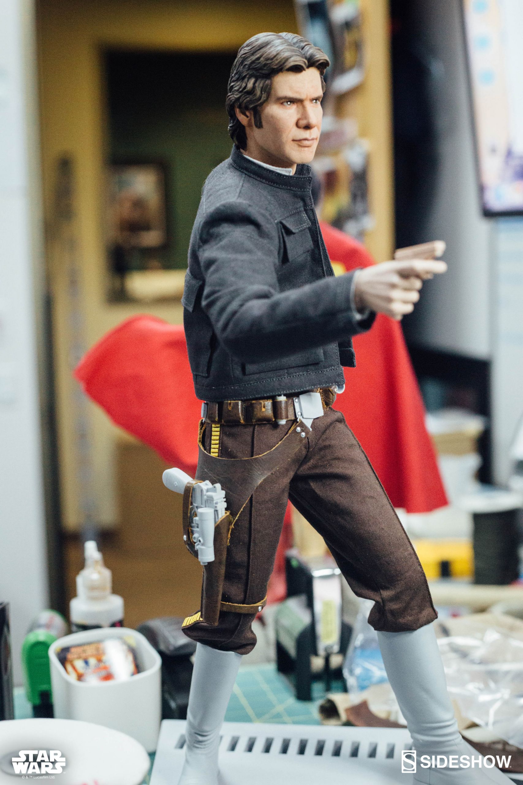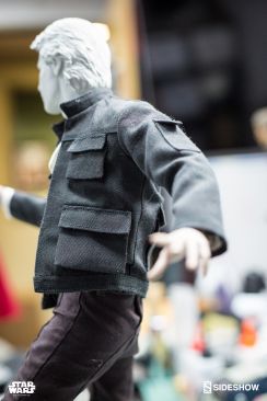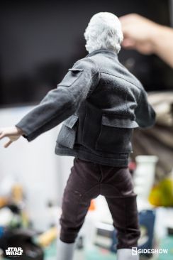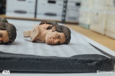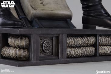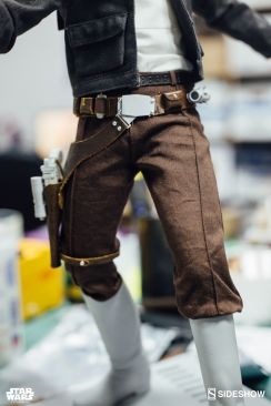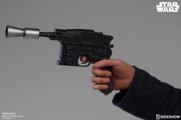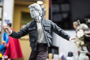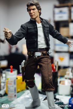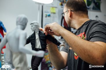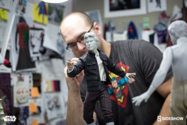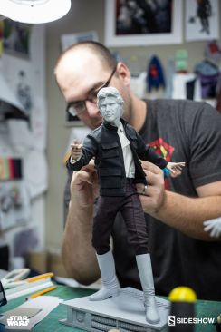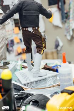 Starting Thursday, May 4th, 2017 sometime between 9:00 AM and 12:00 Noon Pacific Time, fans will be able to pre-order an all new Star Wars Statue from Sideshow Collectibles. Photos and details have been released for their upcoming Star Wars – Han Solo Premium Format Figure. Not only do we get official product shots, but some great behind the scenes photos on the making of the statue. The Han Solo Statue features the likeness of actor Harrison Ford, a fully tailored outfit and a Millennium Falcon themed statue base. If you purchase the Sideshow Exclusive edition, you can swap out the DL-44 heavy blaster pistol for a hand holding an E-11 blaster rifle.