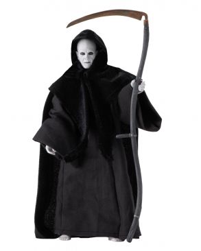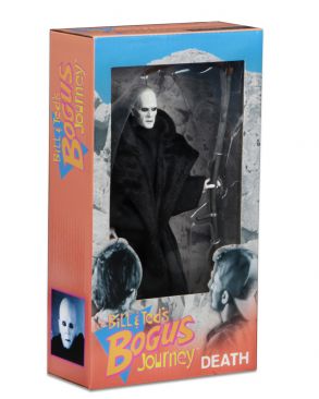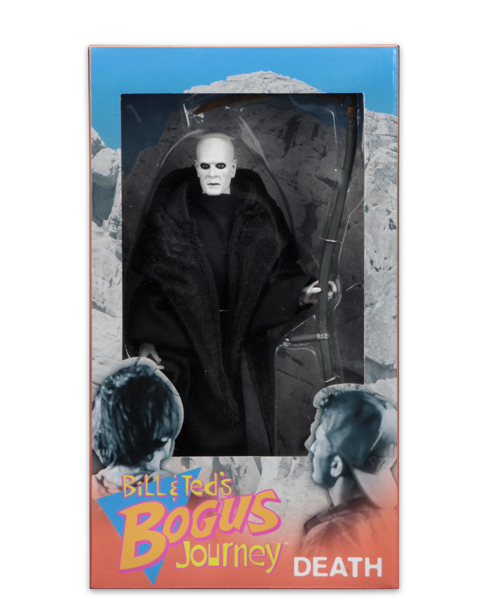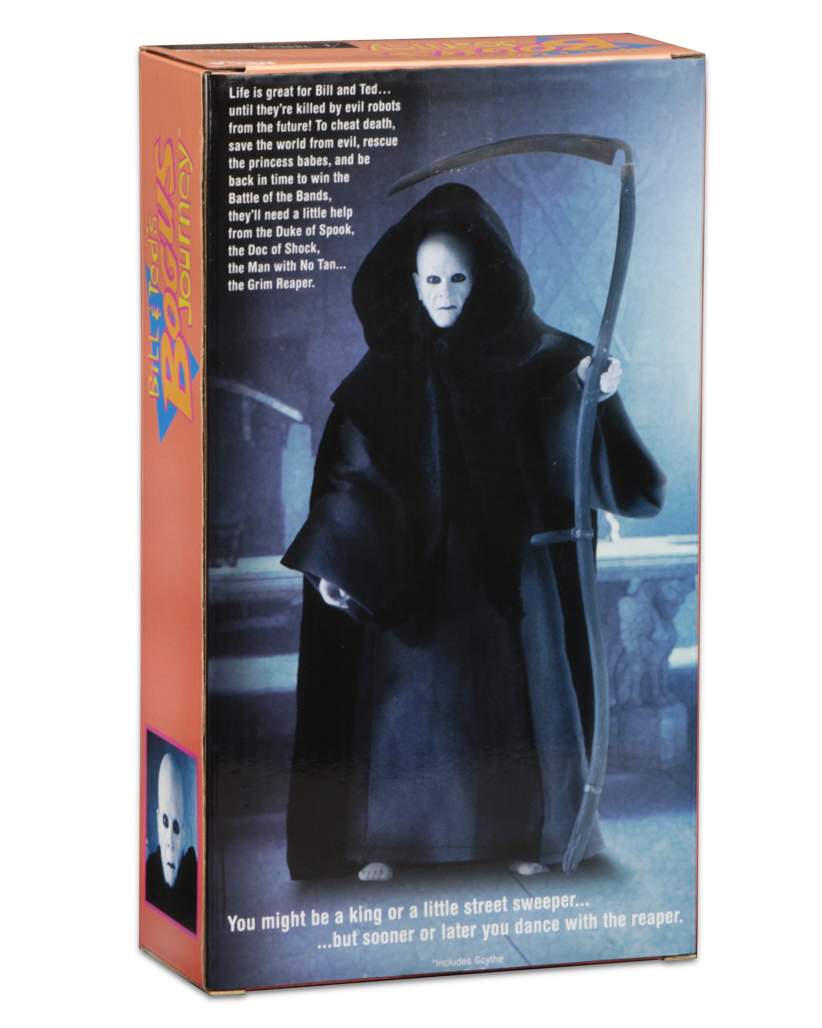 From Bill and Ted’s Bogus Journey! Whether you call him the Duke of Spook, the Doc of Shock, or the Man with No Tan, Death is now a truly excellent clothed action figure. Life is great for Bill and Ted… until they’re killed by evil robots from the future! To cheat death, save the world from evil, rescue the princess babes, and be back in time to win the Battle of the Bands, they’ll need a little help from the Grim Reaper himself. Death stands 8” tall and features the authorized likeness of William Sadler. The fully poseable figure has a mixed media fabric robe and cowl, and comes with a scythe accessory. Window box packaging.