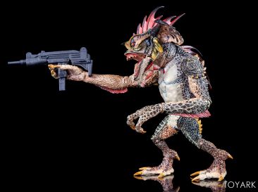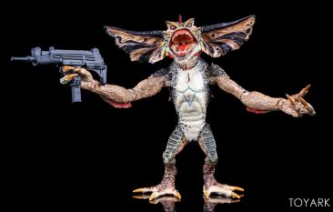 The Gremlins line has seen some of their best releases over the past couple years. With the Ultimate Gizmo, Bat Gremlin and Spider-Gremlin (not to mention the additional Mogwaii), NECA has crafted some great representations of these creatures. Mohawk continues that success with another excellent figure. This figure stands a little over 6″ tall, towering over the Mogwaii figures. The figure is nicely articulated, with about 15 total points. the elbows and knees are single jointed, but range of motion is excellent. There are no issues holding the gun with both hands and posing in a static or aiming pose. Extending the arms out, setting in a walking pose and more poses are all easy enough to achieve. The sculpt features a hinged jaw as well. NECA also corrected a problem I had with the NES version of the figure. The feet on that figure were a softer plastic, which made it hard to keep the figure standing. That is not a problem here, as the feet are a much harder plastic now and Mohawk has a much easier time standing. If desired, the bottoms of the feet have peg holes that can accommodate the NECA stands. The detail on the figure is exceptional. The figure is full of fine, intricate details. The gross, scaled skin looks great, with small spikes, horns, little bubbles all helping top give a film accurate look. The included Uzi is nice looking, with a pretty accurate sculpt. The gun is constructed in a harder plastic, so warping isn’t an issue.