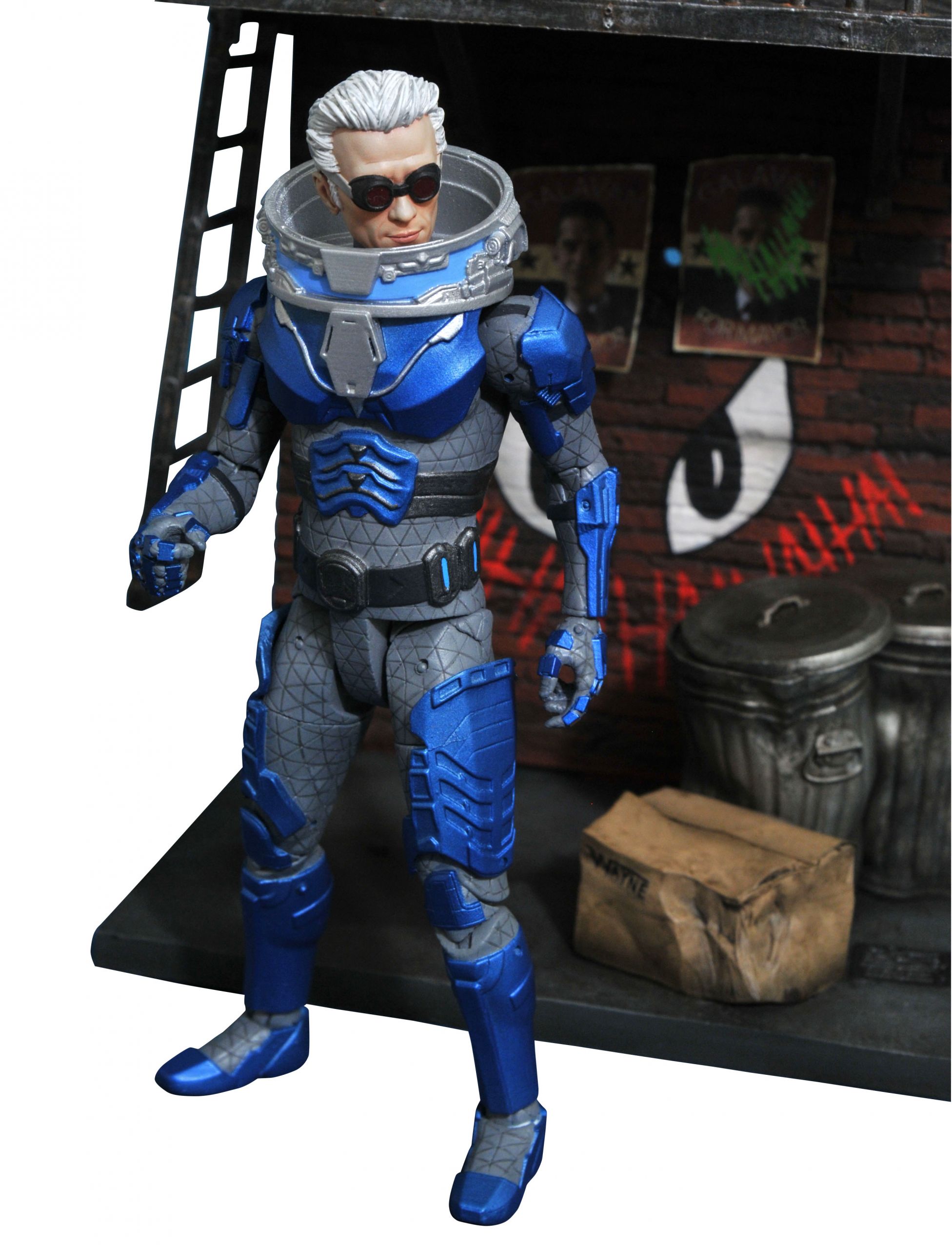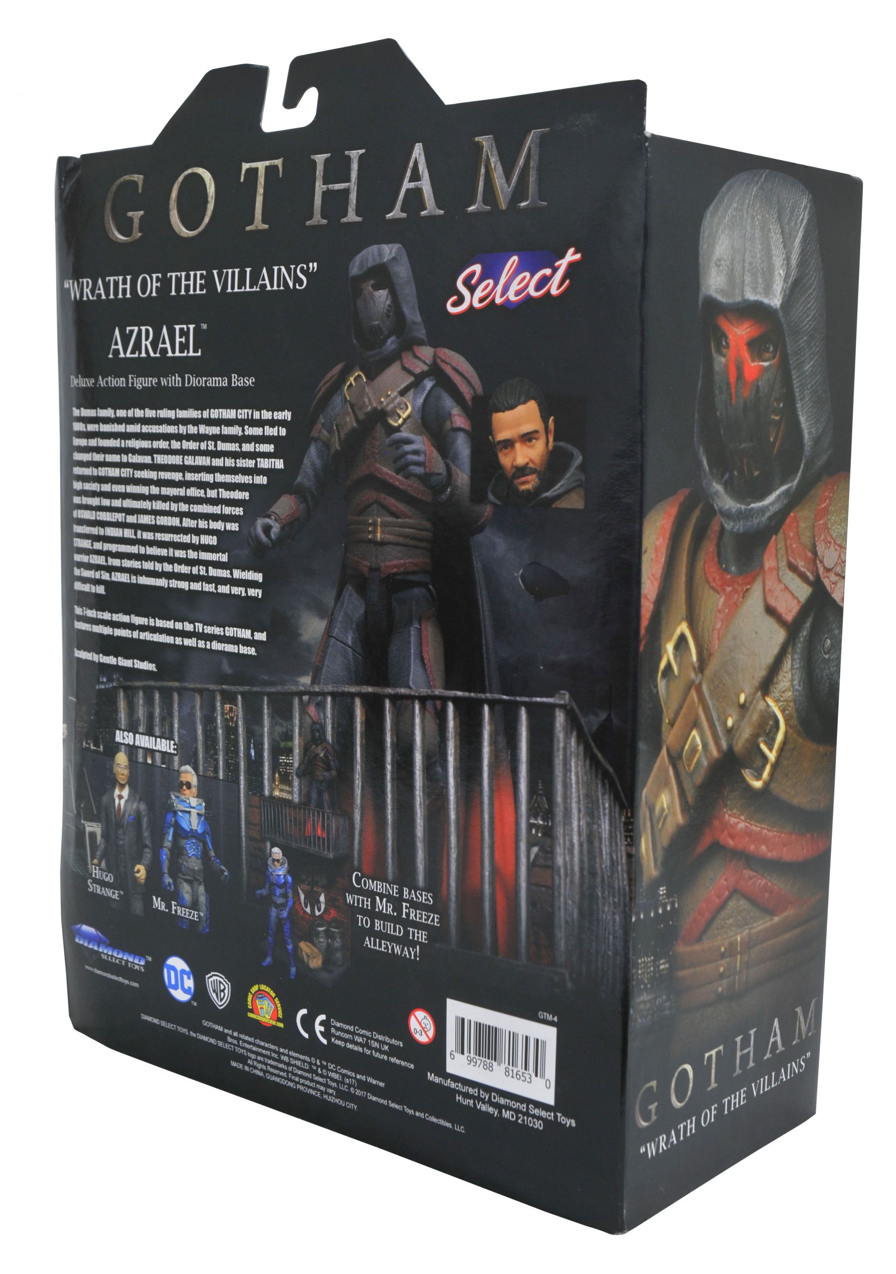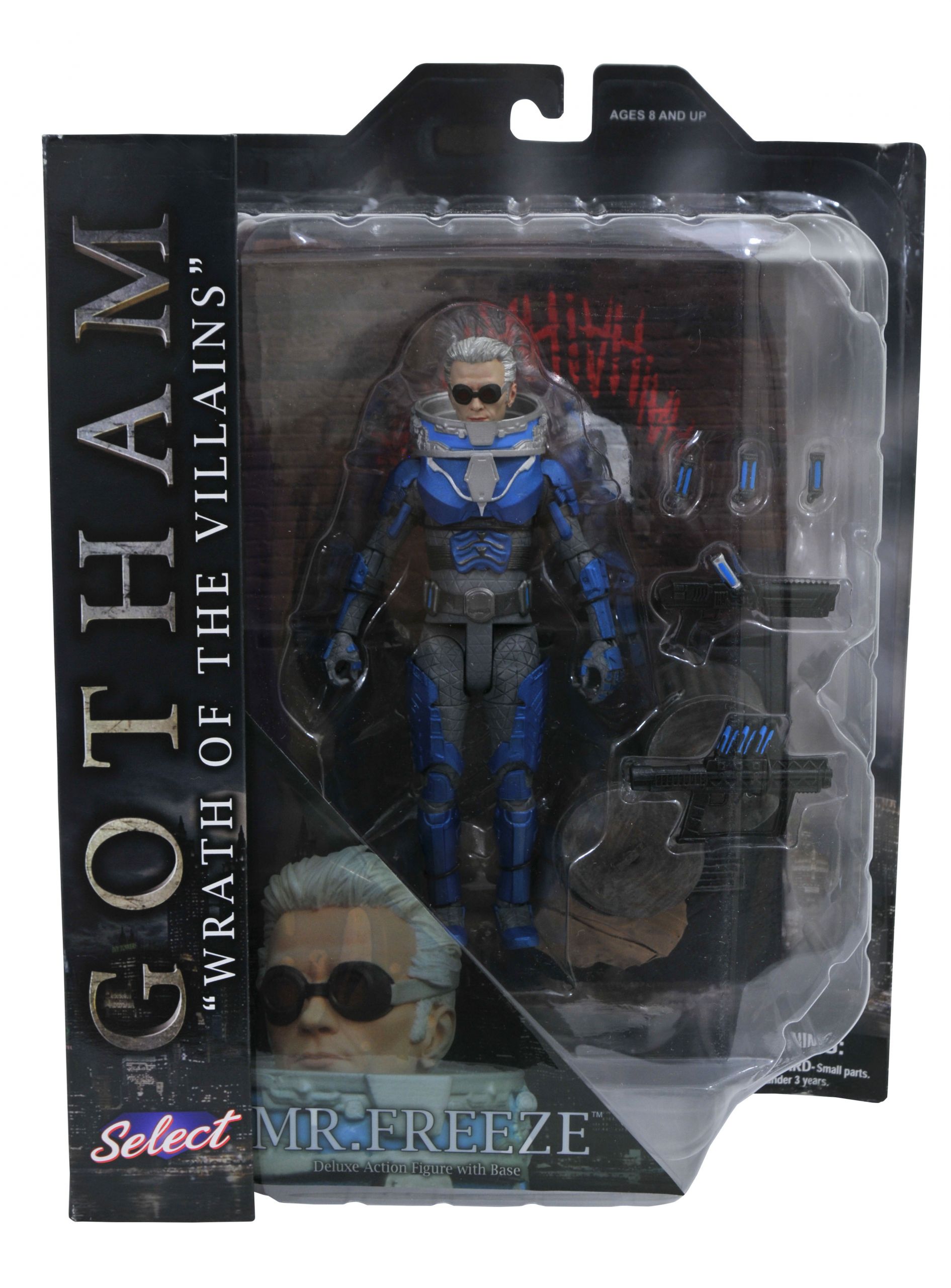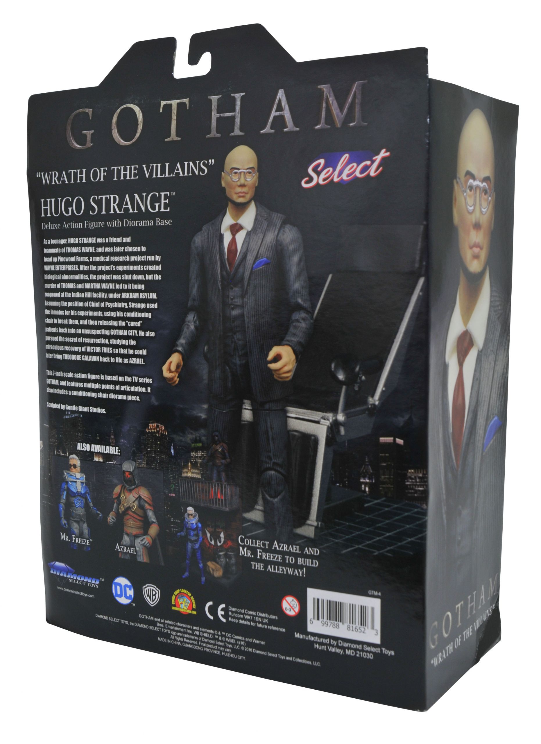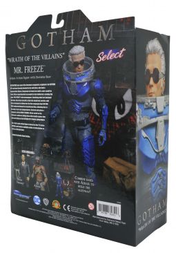 Gotham TV Select Series 4 Mr. Freeze Action Figure (Item #SEP168899, SRP: $24.99)Just when you thought it was safe to go back to Gotham! The critically acclaimed action figure line based on the hit Fox TV series serves up the Wrath of the Villains, with three new 7” scale figures of Gotham’s most dangerous men! Azrael, Mr. Freeze and Professor Hugo Strange each feature up to 16 points of articulation as well as character-appropriate accessories, and each comes with an awesome diorama piece inspired by the show! Hugo Strange comes with the conditioning chair from Arkham Asylum, and Freeze and Azrael each come with part of an alleyway, with Joker grafitti and political posters! Collect them both to build the diorama! Packaged in the display-ready Select packaging with side panel artwork for shelf reference. Sculpted by Gentle Giant!