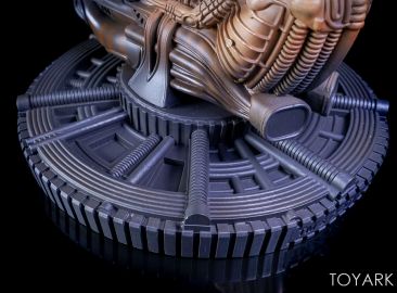 The Space Jockey itself is ready for display immediately after opening. There’s no assembly required. The statue is cast in a metallic resin. Each statue is hand painted after production. Using resin for the statue adds some nice weight to it, while also keeping the entire thing sturdy. No parts of it feels fragile or looked like it would have breakage issues. The statue weighs in at roughly 5.5 lbs and stands just about 9″ tall. The sculpt here is nicely detailed, with a more smooth finish metallic areas compared to the slightly textures Space Jockey itself. The statue, I was told, is hand painted. It looks like they used a combination of airbrush and and traditional paint brushing. In some areas you can see the nice brush strokes, especially in areas using a lighter color to add highlights. While the paint apps are handled well, I would like to have seen a more traditional dark paint wash over the whole thing. That would have broken up the airbrushed look for much of it, while also really bringing out the sculpted details. Right now it looks a bit too clean and not as aged looking as it could be.