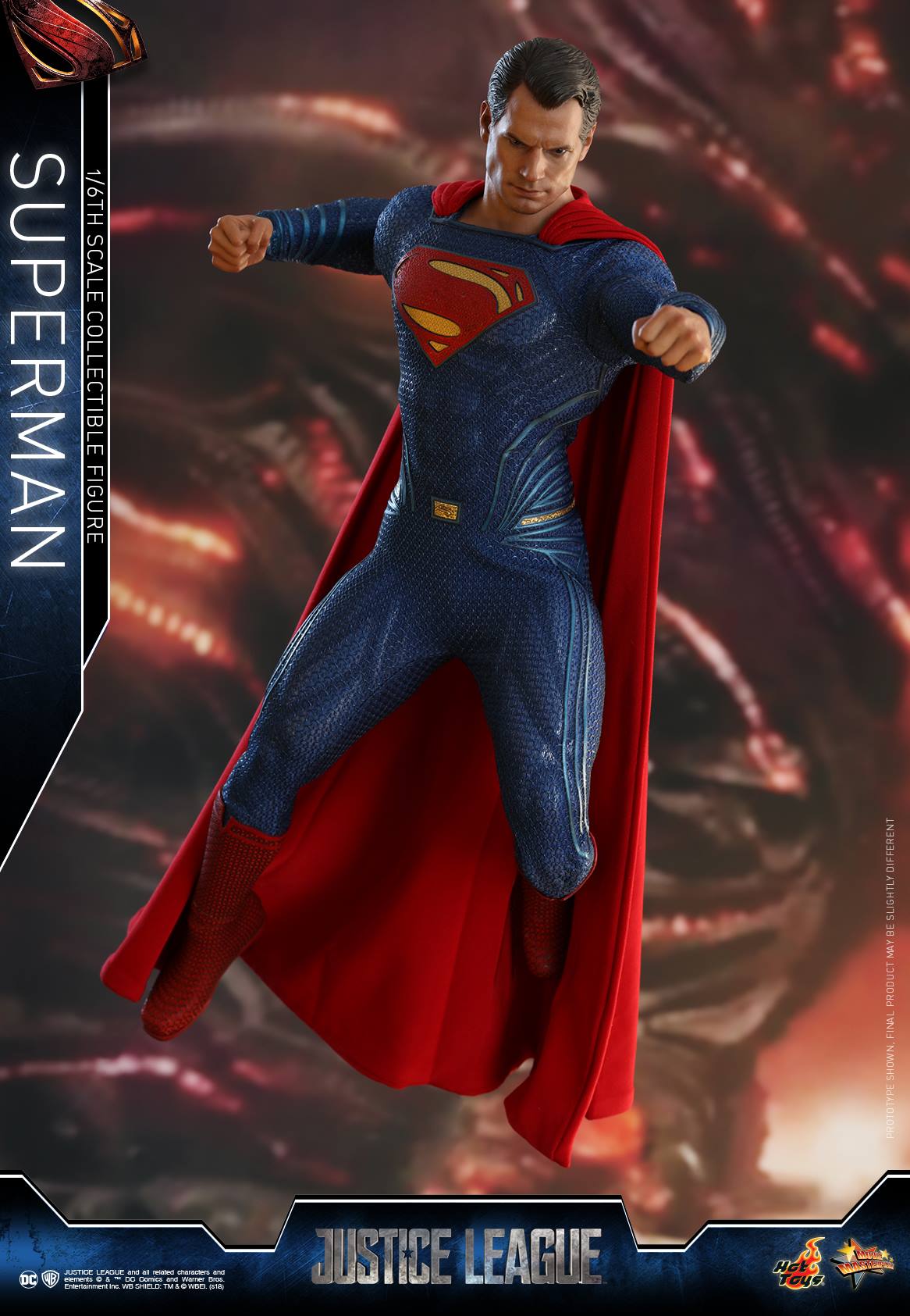 Expertly crafted based on Henry Cavill’s appearance in the movie with astonishing likeness, the Superman collectible figure features a newly developed LED light-up head sculpt that accentuates Superman’s unique heat vision ability coming from the eyes as well as a interchangeable newly painted head sculpt, a newly developed muscular body, a finely detailed and meticulously tailored costume with metallic superman icon on chest, and a specially designed Justice League themed figure stand.