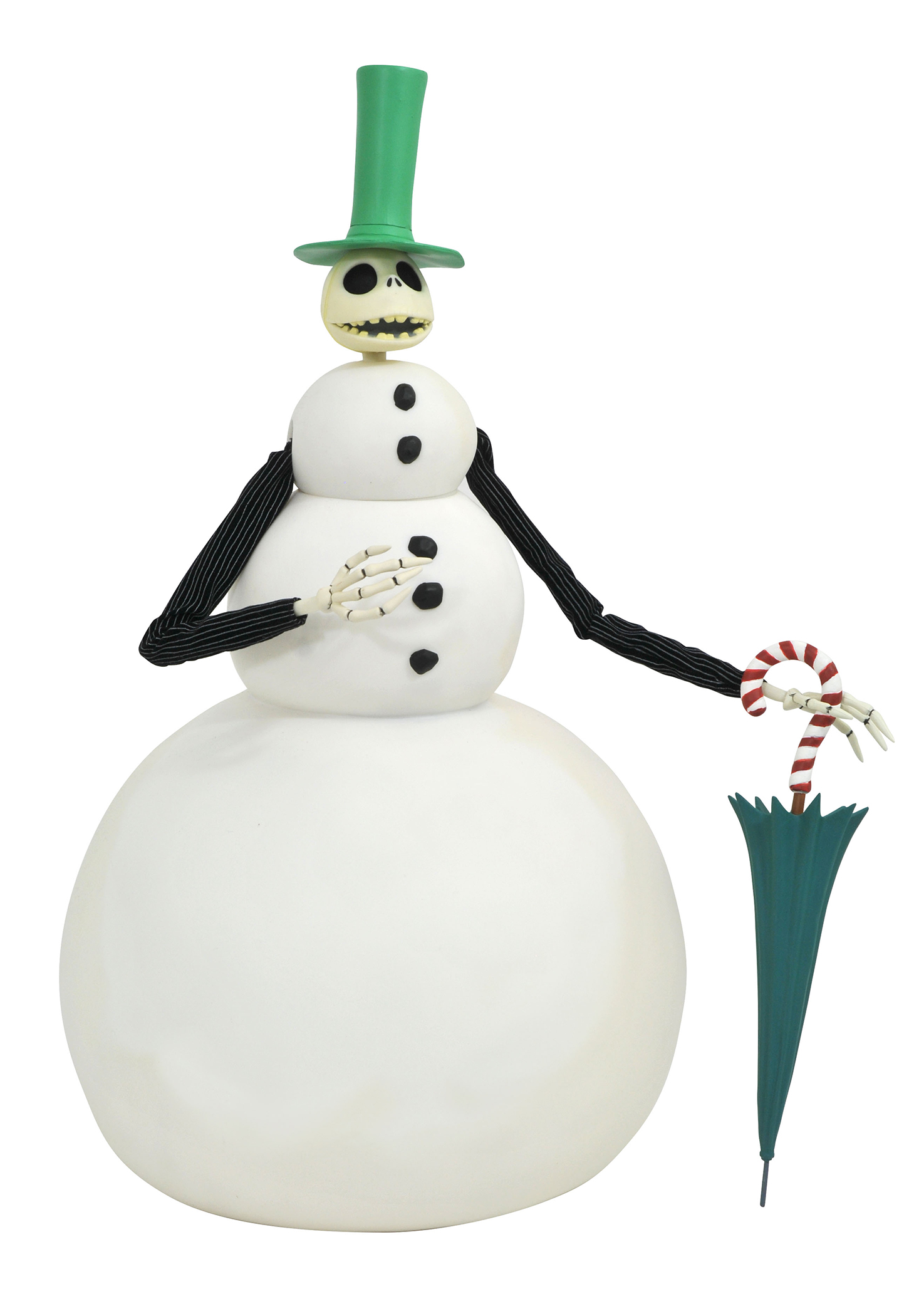 A Diamond Select Toys Release! The Nightmare Before Christmas Deluxe Collection is back, and it’s more deluxe than ever before! Two new releases take the line into new territory, with Snowman Jack – who includes a removable snowman costume, with hat and umbrella – and Lock, Shock and Barrel, the line’s first three-pack, with removable hat and masks! Each cloth-costumed figure looks like it stepped off the movie screen, with multiple points of articulation. Lock, Shock and Barrel measure approximately 5 inches tall, and Jack measures 16 inches tall with doll stand.