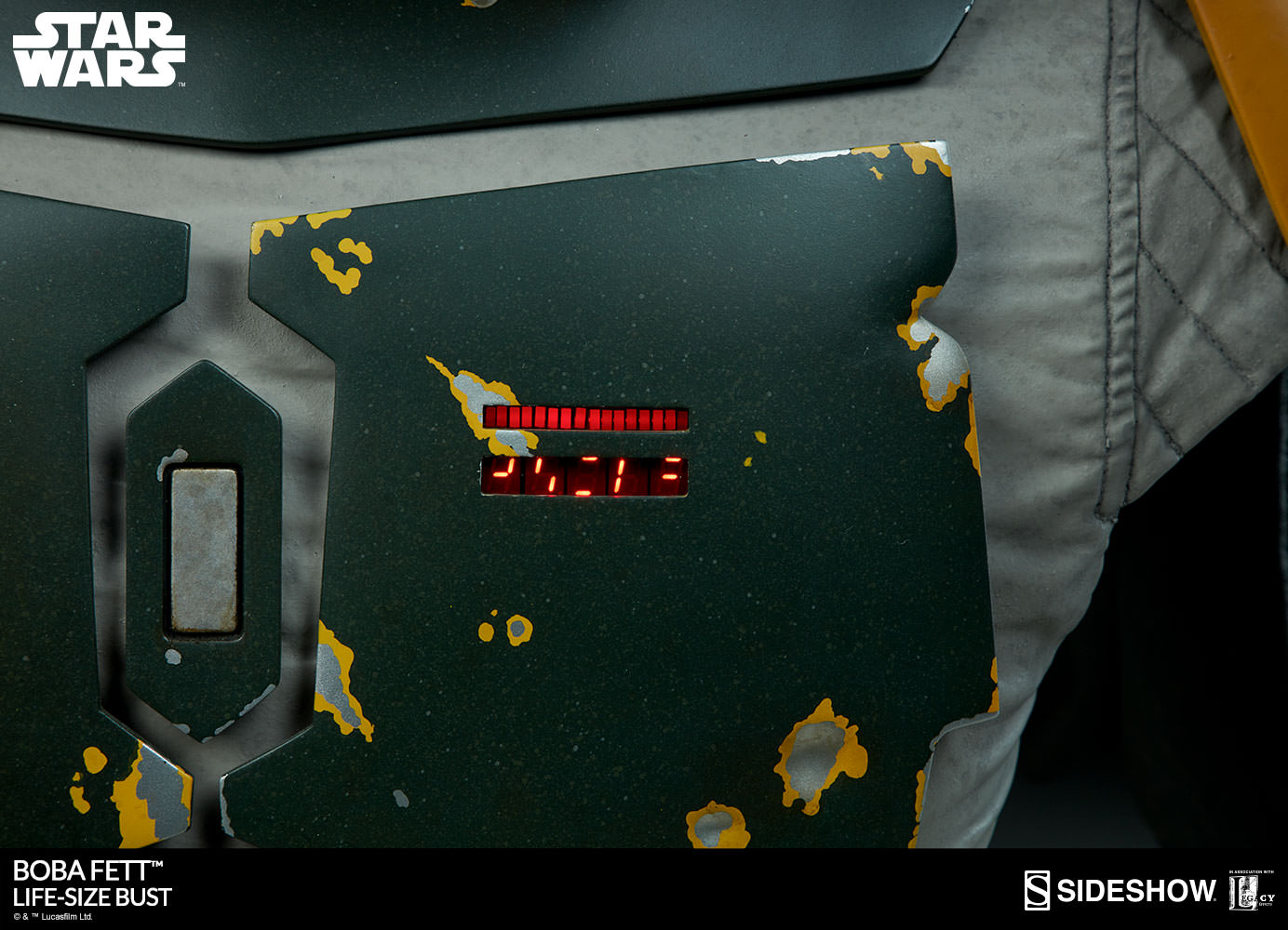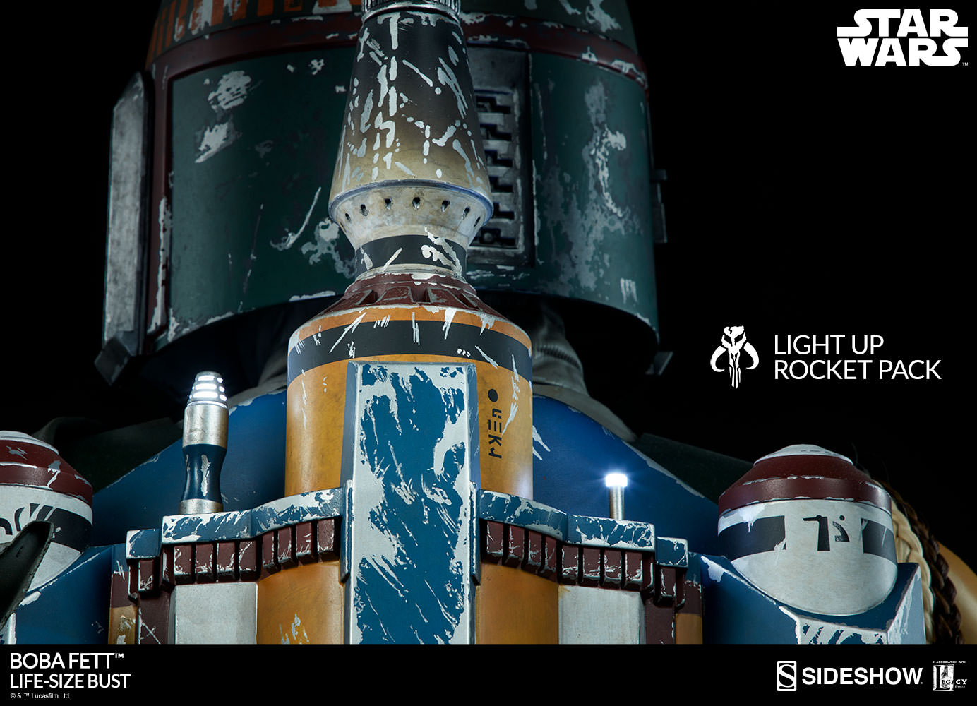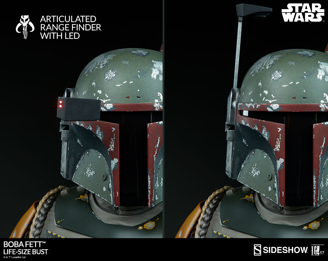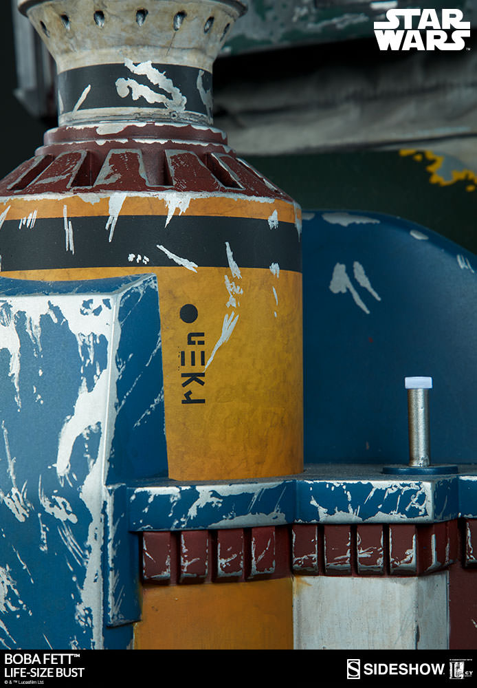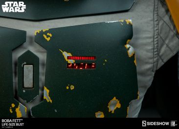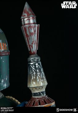 The newest Star Wars Collectible coming from Sideshow has been unveiled. They have released an update, giving us a full look at their upcoming Star Wars Boba Fett Life Size Bust. From the details, it looks to be based on Boba Fett’s look in Star Wars: Episode VI – Return of the Jedi. The bust stands over 30″ tall. The helmet has an articulated neck, as well as an adjustable range finder. He also featured LED lights in his chest and on his rocket pack. See the details below and more photos after the jump.