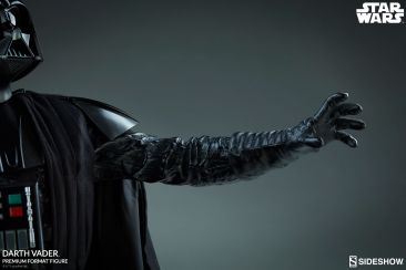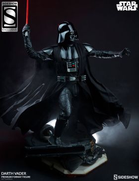 Darth Vader holds his red-bladed lightsaber above his head in a pose of dark rage as he decimates the Rebellion fleets. He is suited in his intimidating and iconic black costume, sculpted with realistic fabric-like textures on the arms and legs, as well as sculpted shoulder and chest armor. His helmet has clear lenses, and features the chilling stare of the Empire’s most infamous Sith. The polystone Darth Vader Premium Format™ Figure also features a tailored fabric tunic and billowing black cape that includes internal wiring for custom posing options.