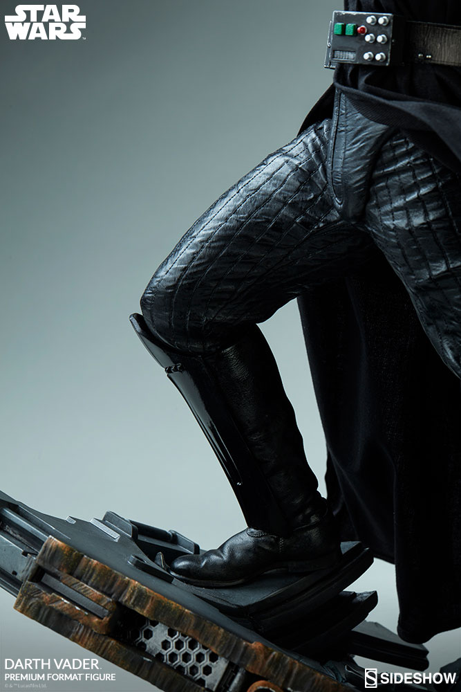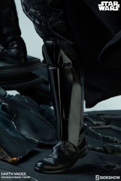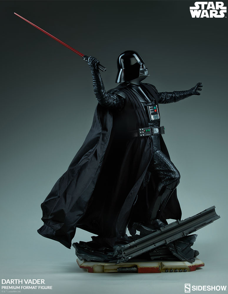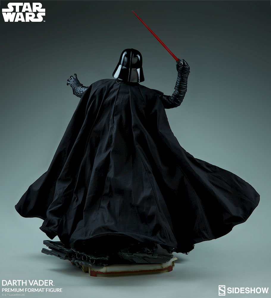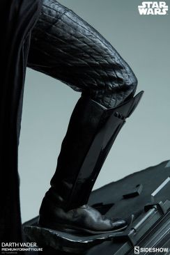 The Darth Vader Premium Format™ Figure measures just over 25” tall, as the Sith lord stands among the remains of a Rebel command ship base. Torn apart by his fury and lightsaber, the exposed mechanical insides of the ship still smolder with painted details of heated metal and shattered flooring.