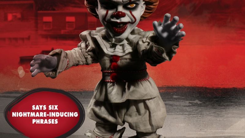The M.D.S. Mega Scale Talking Pennywise stands at a forbidding 15” tall, is dressed in a real cloth clown suit, is fully articulated and says some of his most nightmare-inducing phrases from the film.