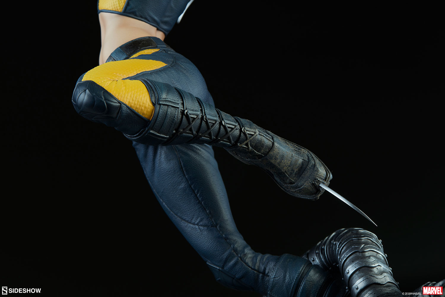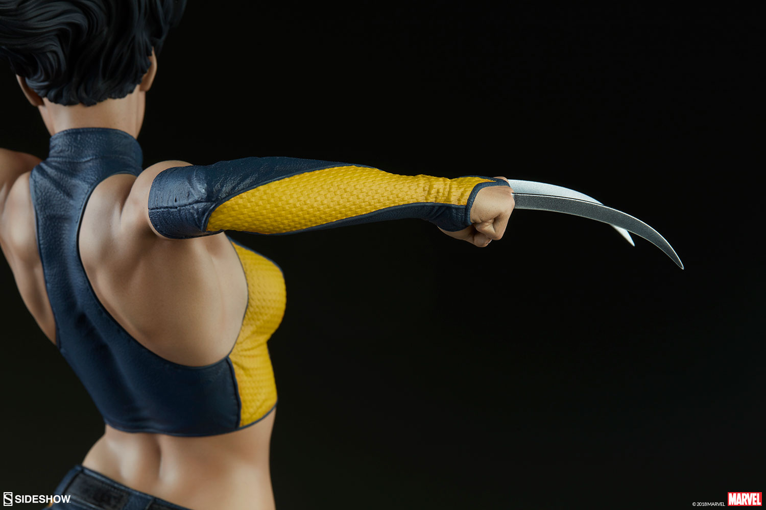 The polyresin X-23 Premium Format™ Figure wears a sculpted costume, with yellow and dark blue paneling detailed to mimic realistic fabric-like textures. Her costume also features matching gloves, a black belt with a red and gold “X” buckle, and boots detailed with “X” treads.