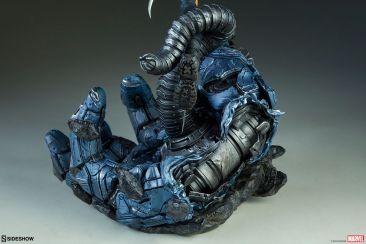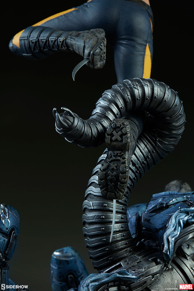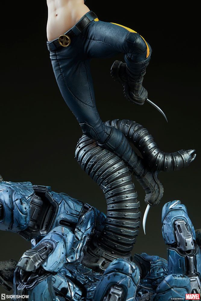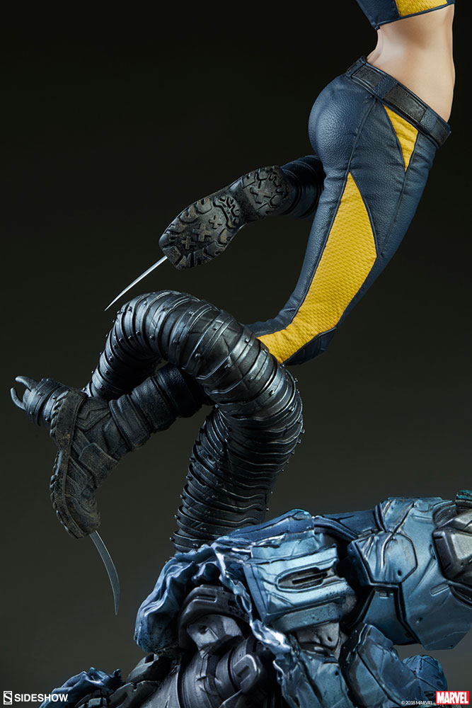 The X-23 Premium Format™ Figure stands 25” tall, as Laura Kinney leaps into the fray on top of a severed Sentinel hand base while a mechanical arm reaches up to grab her. With a quick SNIKT, she’s ready to tear up her enemies with dual metal knuckle claws and her signature toe claw exposed.