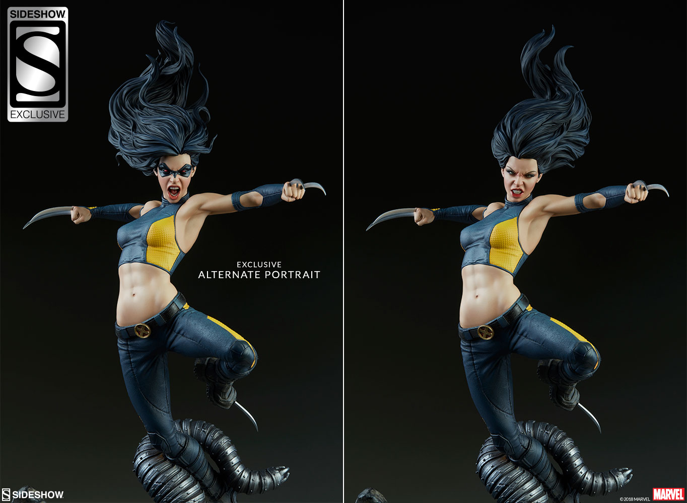The Exclusive Edition of the X-23 Premium Format™ Figure includes an alternate masked portrait with a raging expression and red eyes. Unleash X-23’s frenzied fury with this action-packed additional display option.
