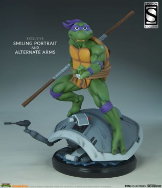 The Exclusive Edition of the Donatello Statue includes an alternate set of arms, with a right hand holding the bo staff back and an open left hand. This edition also features a swap-out portrait with a happy grin on Donnie’s face, giving you additional display options when assembling your shelf of shelled heroes.