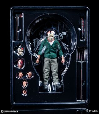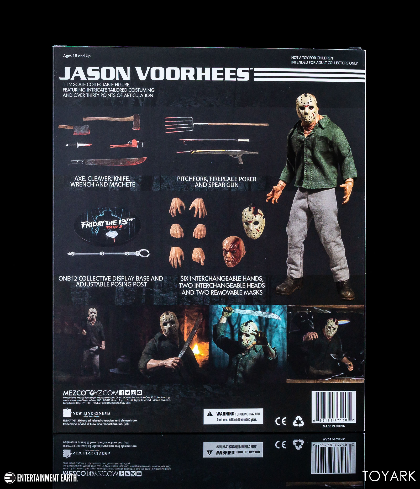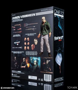 The Jason Voorhees figure comes packaged in the standard Mezco One:12 style box. Jason is packed in a collector friendly window box with a slip cover. The slip cover features a bit of subtle art on the front, with Friday the 13th Part 3 style art on the sides. The back of the slipcover showcases the figure and every accessory that’s included. This is a packed release. Jason includes a standard head, a battle damaged head, two masks, eight interchangeable hands, an axe, a machete, a cleaver, a knife, a pipe wrench, a harpoon gun, a fire poker, a pitchfork, and a figure stand.