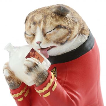 Every starship needs an experienced engineer ready to lick any problem, a miracle worker who thinks on his paws. Luckily, the Enterprise has the best cat in Starfleet.Montgomery Scott, or Scotty Cat as we call him, comes holding a bottle of very, very, very old Scotch Milk… to stimulate the senses, of course.