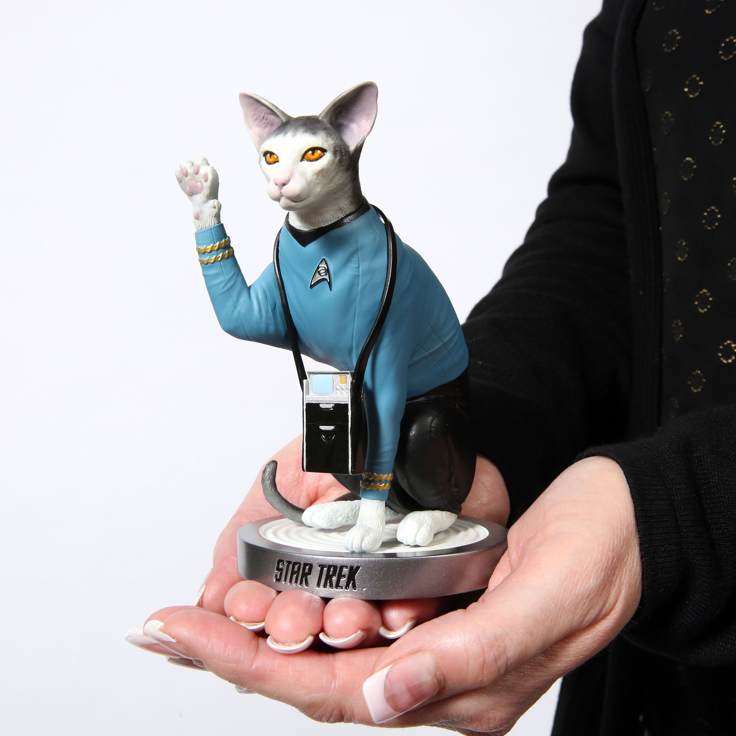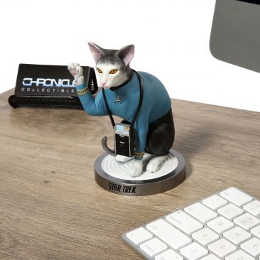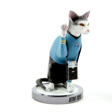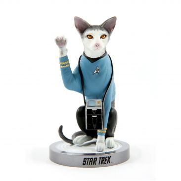 A Spock Cat? Highly illogical! But wait, maybe not. Both cats and Spock peer curiously into the actions of those around them. Both have pointy ears. And both find the illogical and foolish emotions of humans a constant irritant. So, Spock Cat is actually the perfect convergence of felines and everyone’s favorite Vulcan. Fascinating…Sitting almost 6” tall, Spock Cat features him holding up his iconic Vulcan salute and carrying his trusty tricorder. He comes resting on a sleek transporter-inspired base with the Star Trek logo boldly featured on the front.
